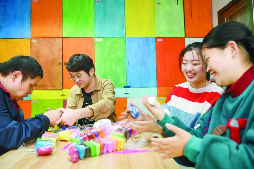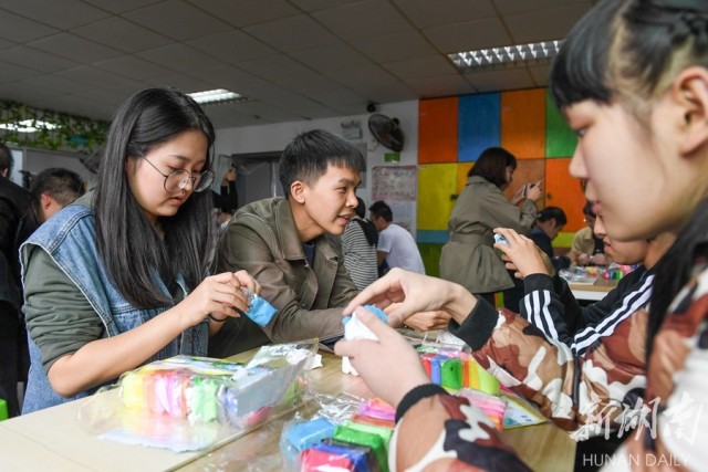 11月6日,志愿者与特殊孩子共同用超轻黏土创作《生命花园》。当天,湖南师范大学美术教育研究基地的24名学生来到长沙市天心区慧灵智障人士社区服务机构,为特殊孩子表演节目,一起交流创作,用爱叩开他们的心灵之窗。湖南日报:关爱特殊孩子原文链接:http://hnrb.voc.com.cn/hnrb_epaper/html/2019-11/08/content_1421481.htm?div=-1&from=timeline