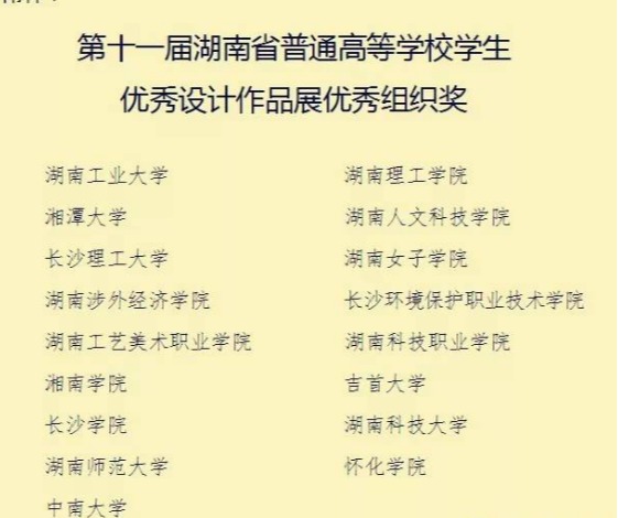 12月27日,在“第十一届湖南省高校优秀设计作品展”颁奖晚会上,我院学子共获得一等奖两个(曾凡虎、周坤琳)”;二等奖六个(鄢艳、魏筱、黄励强、黄琦琼、苏曼、张敬响);三等奖七个(刘亚晨、陈剑、周颜、王楠、...