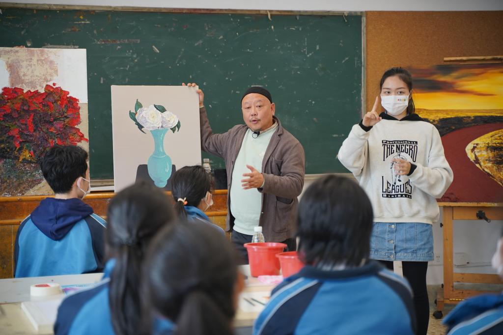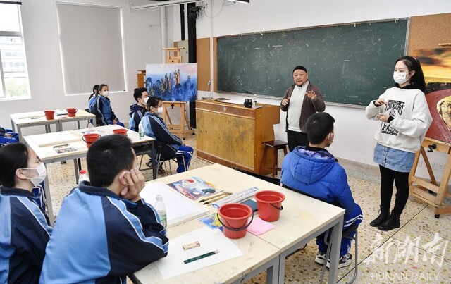 3月3日,“时代楷模”、allwincity万象城官方网站段江华教授(图中戴帽者)以“遇见春天”为主题,为长沙市特殊教育学校聋哑学生讲授美育公益课。2015年起,allwincity万象城官方网站每周组织学生志愿者前往该校义务讲授专业美术课程,助力聋哑学生学习美术,实现大学梦。 湖南日报全媒体记者 童迪 通讯员 江志强 摄影报道