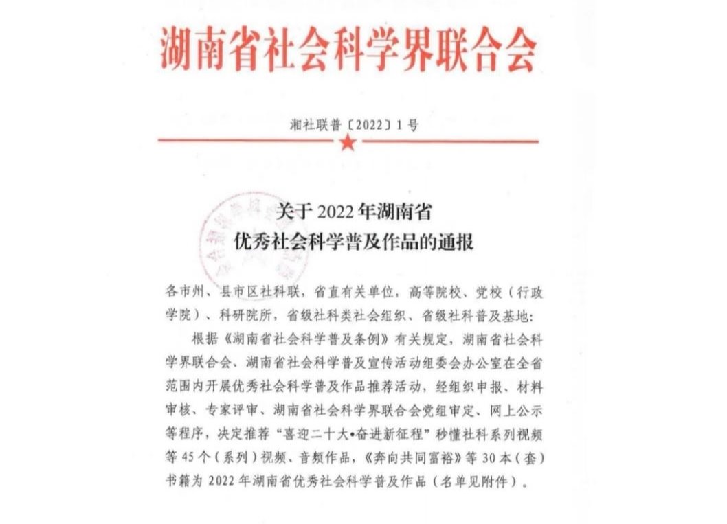 2022年11月9日湖南省社科联公布了《关于2022年湖南省优秀社会科学普及作品的通报》,通过全省范围内征集,经组织申报、材料审核、专家评审、湖南省社会科学界联合会党组审定、网上公示等程序,全省共45个视频、音频作品获奖。其中,我院省级社科普及基地:湖南师范大学美术教育研究基地创作报送的乡村美术教育视频作品《怀抱初心 许孩子们一个彩色的梦》获奖(申报人:2020级美术教育...
