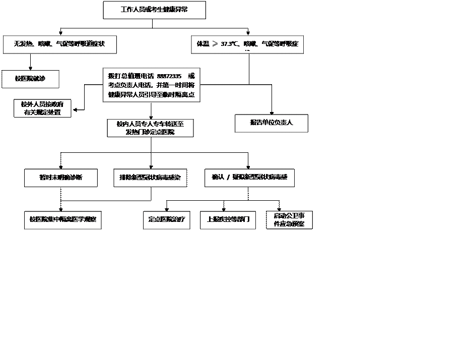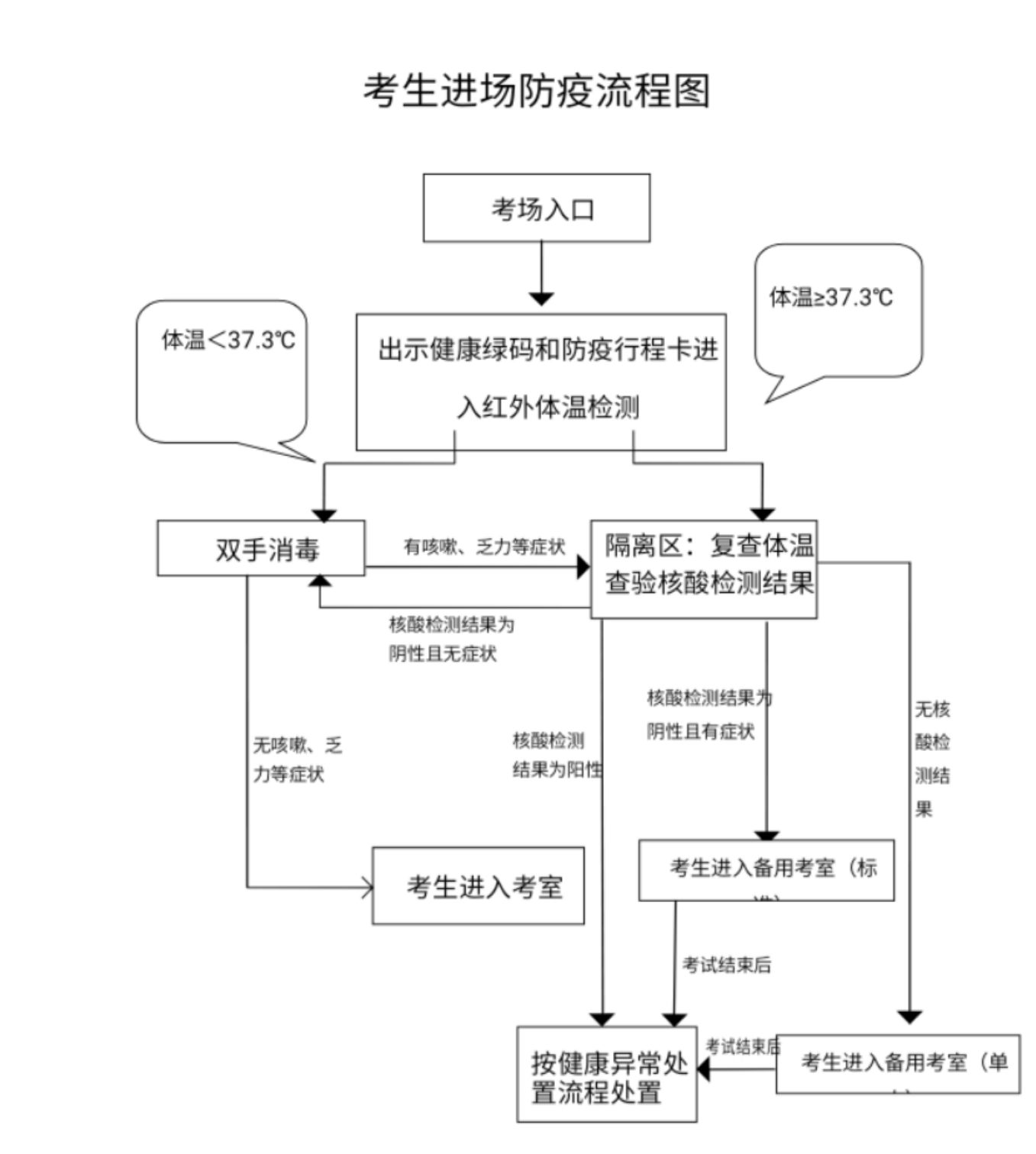 4.重新测量体温正常者进入考室;体温仍然超过37.3℃者,送疫情防控定点医院进行进一步检查,同时报告学校防控办。