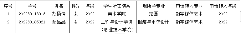 本次我院共收到5名学生提交的转专业申请,经审查,有胡扬清等2名同学通过报名资格审查,现将名单予以公示。公示期为2023年9月7日至2023年9月11日。