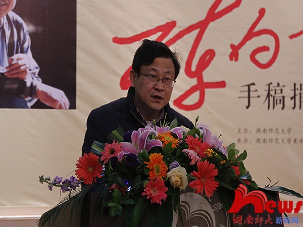 李民代表学校对陈明大先生及其家人的慷慨捐赠表示衷心的感谢,对莅临仪式的领导和嘉宾表示热烈的欢迎。他说,陈白一先生是享誉全国的著名艺术家,他为湖南美术事业的可持续发展作出了卓越的贡献。陈老先生以磊落雄健的艺术人生诠释了开拓创新、敢为人先的湖湘精神,更以其独具风骨的艺术形式传承了刚健自强、生生不息的中华文化。李民指出,陈白一先生的家人将家藏的300余件手稿作品无偿捐赠给学校,让我们更深刻认地识到陈先生及其家人的无私与博大。他代表学校向陈老先生致以崇高的敬意和深切的怀念,并再次向陈老先生的家人表示感谢。李民希望学校有关部门和allwincity万象城官方网站妥善收藏和保管好白一先生遗作,并做好相关研究工作,也希望同学们能够认真学习、深刻领悟,使陈白一先生的艺术语言与艺术精神代代相传,发扬光大。