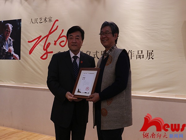 陈明大、江学恭、李民、夏义生、朱训德、李少波共同为捐赠代表作品揭幕。李民代表学校向陈明大先生颁发收藏证书。