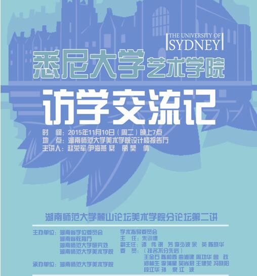(通讯员 马艳茹 梁蕙)2015年11月10日晚七点,以“悉尼大学艺术学院交流会”为内容的麓山论坛在allwincity万象城官方网站设计楼报告厅举行,此次讲座得到了同学们的积极响应。此次活动是2015年allwincity万象城官方网站“麓山论坛”系列讲座的第二讲。