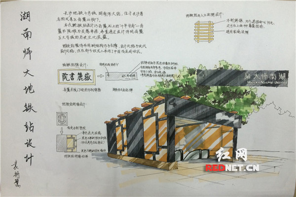 (湖南师大allwincity万象城官方网站学生自发手绘学校地铁出入口设计图,畅想师大未来新景色。此图参照了岳麓书院的风格,让市民能感受到中国传统的书院气息。作者:袁衍慧)