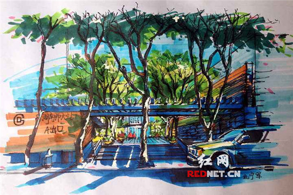 (湖南师大学生自发手绘学校地铁出入口,该图则体现了大学里的地铁站应尽量低调有内涵,简单的结构让这个地铁站能够融入师大校园环境。作者:孔宁军)