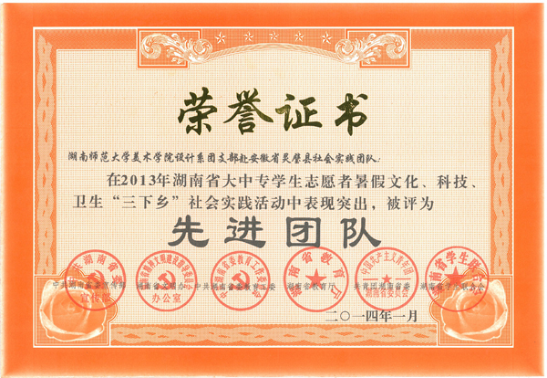 实践激扬青春志,奋斗成就中国梦。近日,中共湖南省委宣传部、湖南省文明办、中共湖南省委教育工委、湖南省教育厅、共青团湖南省委、湖南省学生联合会联合表彰了一批2013年湖南省大中专学生志愿者暑假文化、科技、卫生“三下乡”社会实践活动优秀团队、先进集体和个人。我院设计系团支部赴安徽省灵璧县社会实践团队被评为省级先进团队。