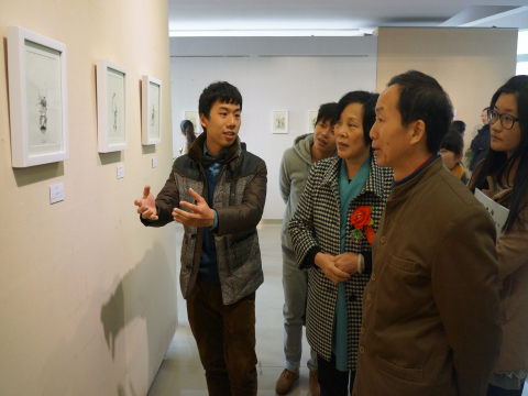 众多艺术爱好者们应赵铭的邀请一同到展厅里观展。观展中,赵铭一路为徐书华和朱训德介绍其画作,赵铭细心的描述着每幅画作的背景和意义,叙述自己创作时的情绪,并和徐书华、朱训德交流心得,徐书华说赵铭的画作很有生活的气息,表示对赵铭的期待和喜爱。