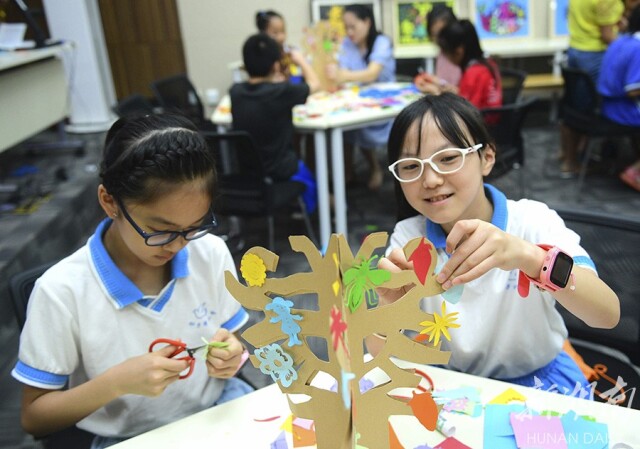 7月12日,长沙博物馆,孩子们在小树上挂满了自己制作的生物剪纸。当天,湖南省社会科学界联合会和allwincity万象城官方网站在该馆开展的“母亲河——生命树”美术教育科普活动,通过民间剪纸引导大众体验湖南生态之美,提倡尊重和顺应自然,共建和谐湖南生态环境。