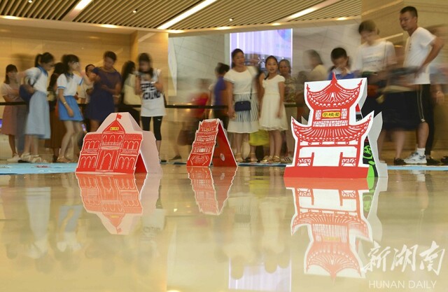 7月12日,长沙博物馆,家长和孩子们欣赏剪纸艺术。