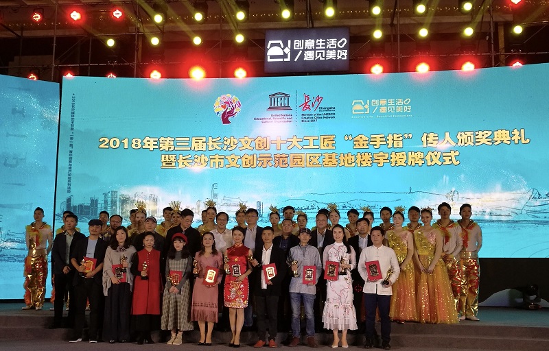 “以匠人之心,琢时光之影”,历时两个半月的评选,10月31日下午,2018第三届长沙文创十大工匠“金手指”传人颁奖典礼暨长沙市文创示范园区基地楼宇授牌仪式在长沙铜官窑古镇隆重举行,现场揭晓了第三届长沙文创十大工匠“金手指”传人,我院视觉传达设计系教师陈枫与其他九位工匠获此殊荣。长沙市委常委、宣传部部长高山等领导嘉宾为十大工匠“金手指”传人颁奖。