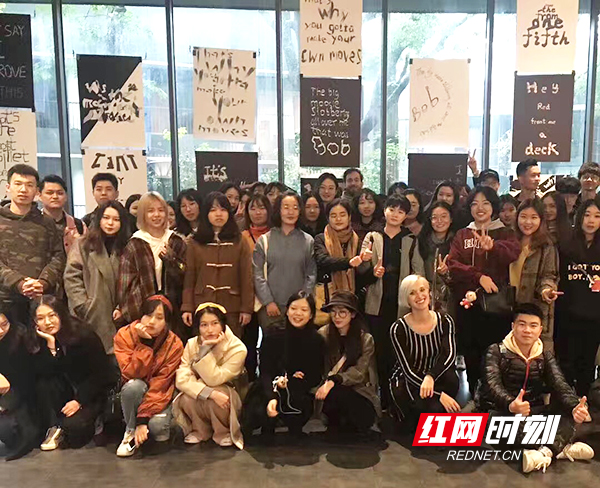 文字设计海报展期间,外籍教师与学生合影留念。资料图