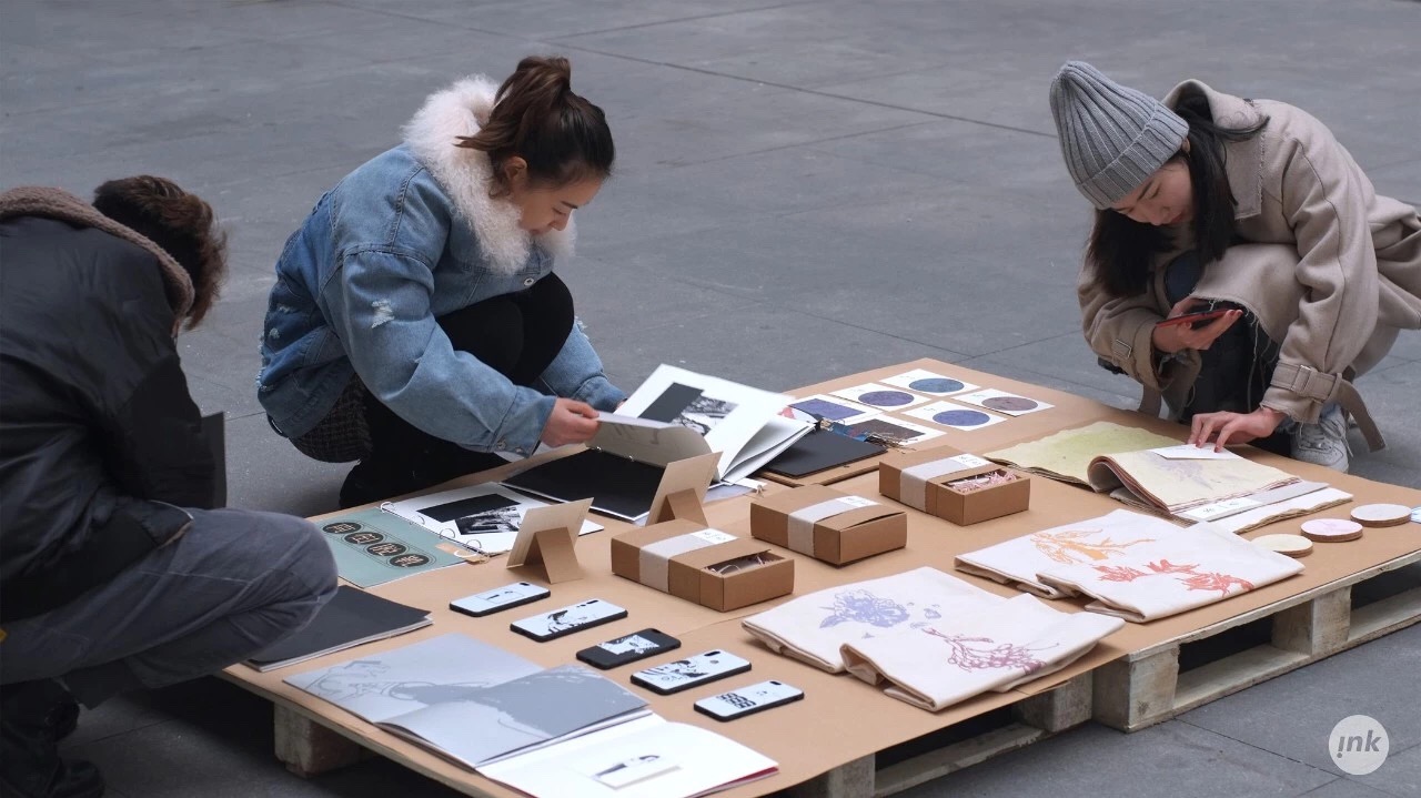 展览空间分为四个部分,由墙面纸质单页创作区、展台文创区、小组创作报告区以及视频播放区组成,而粘贴在墙面的单页是这次课程成果最为重要的部分。同学们为了制作出作品的特殊效果,运用烫金、UV、套印、混印、手工凸印等技术,甚至还有手工制作纸张的小组,结合不同材质的纸张进行试验。