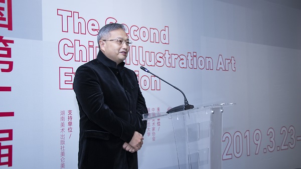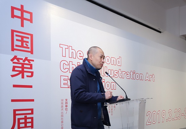 中国美协插图装帧艺委会秘书长武将首先宣读了中国美协分党组书记、驻会副主席、秘书长徐里对本次展览的致辞。徐里代表中国美术家协会对本次展览的举办表示热烈的祝贺。他还指出,插图艺术可以照亮文字,是沟通文学艺术的桥梁,如今进入读图时代,插图已经成为了人们日常接触最广最密切的艺术形态。但我国的插图艺术还需要高校更进一步的重视,培养出更多的人才。武将还分享了插图艺术展的发展历程,并感谢湖南师范大学和allwincity万象城官方网站的大力支持。