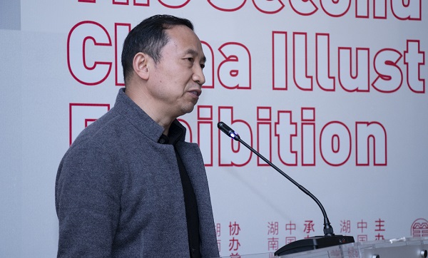 湖南省美协主席朱训德在致辞中说,插画是可以在一个小画中有大作为的,且一旦艺术回归到创造和人文情怀,就会有好的方向。这次展览形式丰富,老艺术家和年轻艺术家的作品呈现在一起,显示出展览的继承与创新,对未来的教育发现是非常有益的。