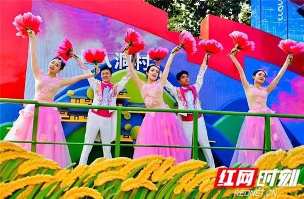 庆祝中华人民共和国成立70周年游行队伍中,湖南彩车“潇湘今朝”备受瞩目。