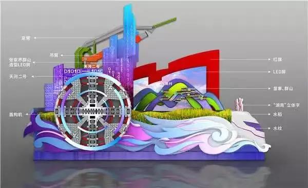 车头造型为抽象化工程概念车和磁浮列车,如同一台缓缓驶过的磁浮列车。车身主体造型为“青山绿水”双绕彩车,水波粼粼,鱼跃其中,以“一湖四水”为原型,寓意湖南始终牢记习近平总书记“守护好一江碧水”的殷切嘱托。车身上方,红旗招展,寓意湖南不忘初心,红色基因代代传承。红旗之下,精准扶贫首倡地十八洞村的微缩模型栩栩如生,摆脱千年贫困,今日十八洞村已换了人间。此外,杂交水稻、盾构机、工程机械泵臂和天河二号等元素,则分别代表湖南省在科研、工程机械、大数据等领域的非凡成就。