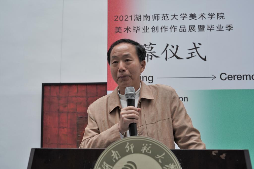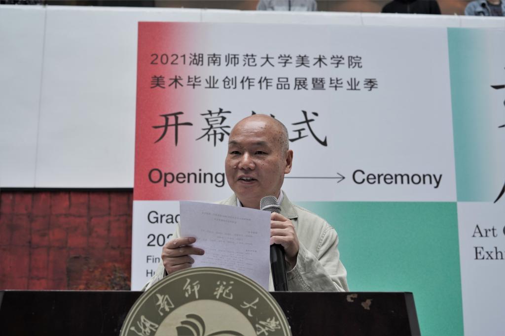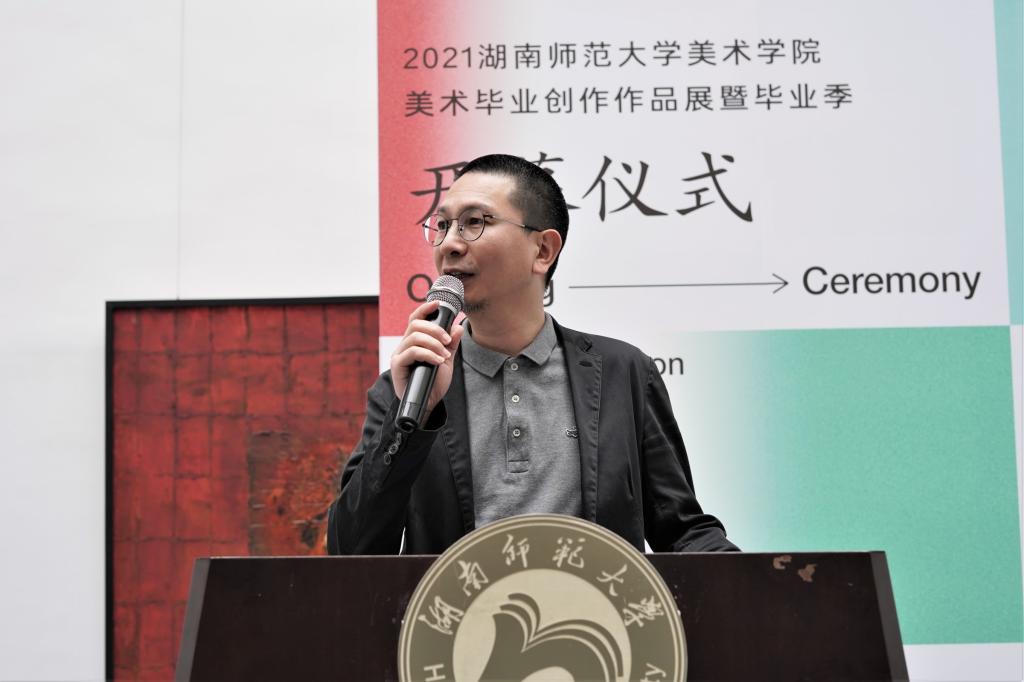 毕业创作指导老师代表石明祥提到了在创作过程中对学生精益求精的严格态度是对同学们的重视和信任,此次毕业展是即将毕业的同学们大学四年辛苦求学、努力上进的证明。最后他祝福同学们前程似锦,未来美满。