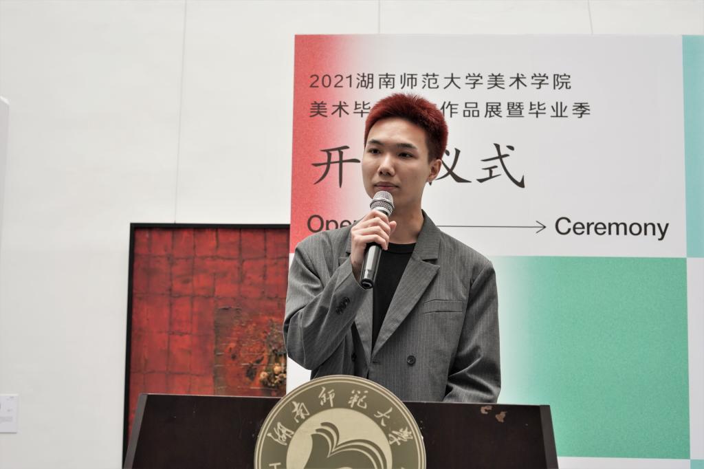 学生代表彭鑫河、岳明鑫表示回想四年的点点滴滴,无论是课堂还是写生,从画笔到设计软件,其中的每一步都离不开恩师和母校的教导,感谢师长一路的关心与教诲,感谢母校提供的教育资源。他们表明这里的每一幅作品都是努力的成果,背后都蕴藏着艺术的心灵,表达了对美好的感知与体会。
