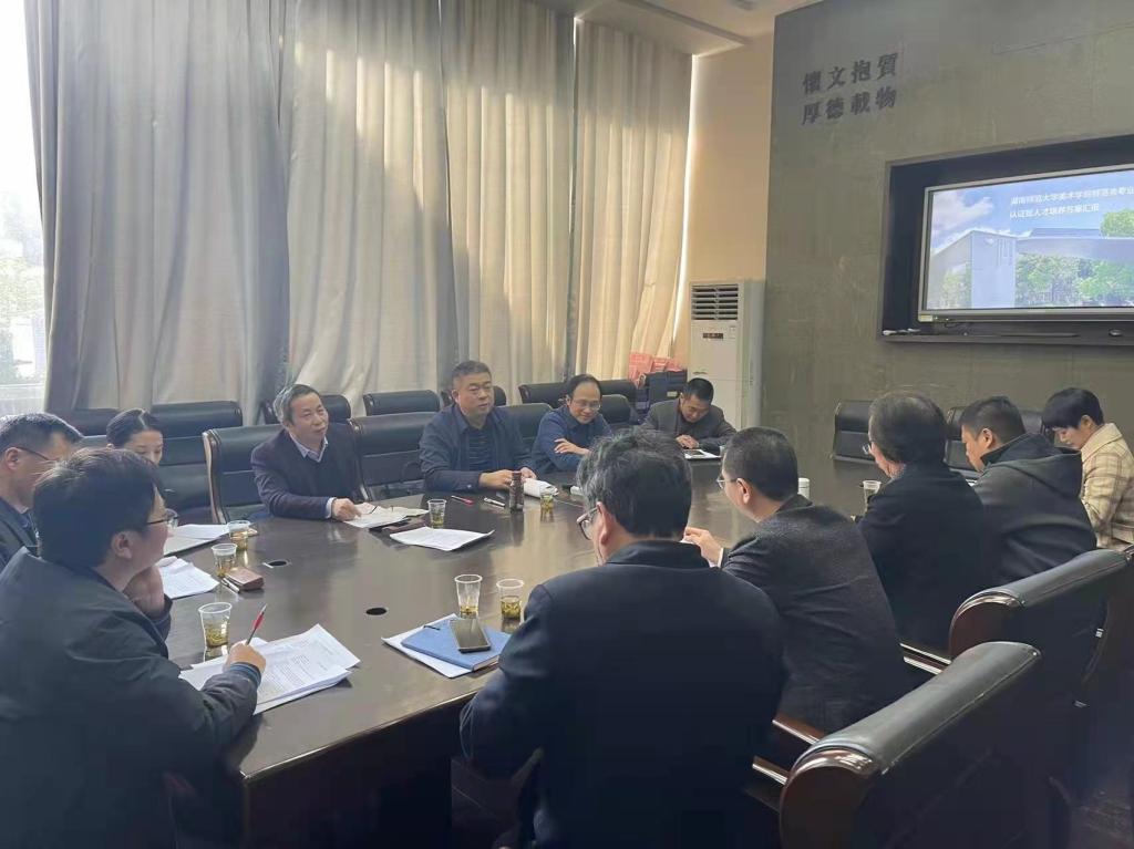 11月8日下午,师范专业认证暨美术学专业本科人才培养方案修订工作汇报会在美术楼二楼会议室召开。学校教务处评建办主任银海强、副主任袁俏、校内评估专家谭长银、陈湘定、谭亮等领导专家一行来我院开展督查工作,院长李少波、院党委书记许杭平、美术学科带头人姜松荣、系主任冯晓阳及美术学教师代表参加汇报会。