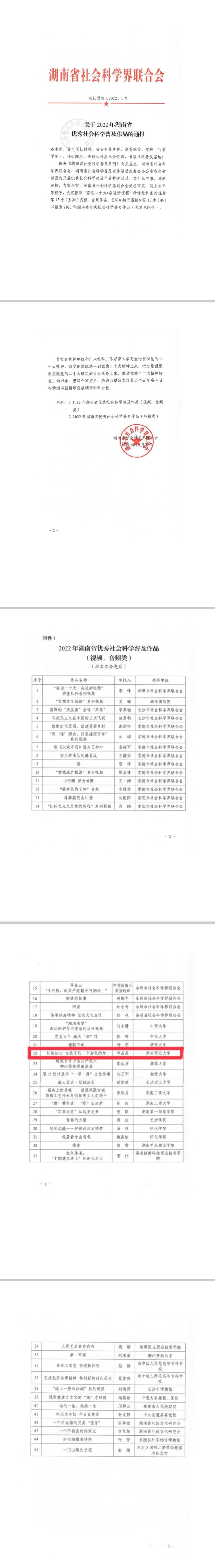 2022年11月9日湖南省社科联公布了《关于2022年湖南省优秀社会科学普及作品的通报》,通过全省范围内征集,经组织申报、材料审核、专家评审、湖南省社会科学界联合会党组审定、网上公示等程序,全省共45个视频、音频作品获奖。其中,我院省级社科普及基地:湖南师范大学美术教育研究基地创作报送的乡村美术教育视频作品《怀抱初心 许孩子们一个彩色的梦》获奖(申报人:2020级美术教育专业郭晶晶 指导教师:肖弋)。
