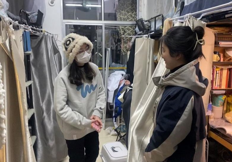 我院党委副书记莫南高度重视学生情况,在长沙急剧降温和疫情突发的情况下迅速做出反应,带领学院思政工作队伍下沉一线工作,设身处地地站在学生角度,来到学生住所了解难处,关心生活,一句句嘘寒问暖,一声声殷切嘱托,饱含着学院思政工作组对同学们浓浓的情意。问起被子厚不厚,问起空调效果好不好,老师们走访途中细心的发现同学们的生活中的难处,老师们特别强调了冬季电器的使用问题,从思想上教育同学们,从根源上杜绝冬季火灾的发生。面对复杂多样的疫情形势,我院思政工作队伍郑重向同学们承诺:你的健康与安全我们为你守护!这句话无疑是同学们的定心丸,让同学们惶惶不安的心里燃起希望与斗志。