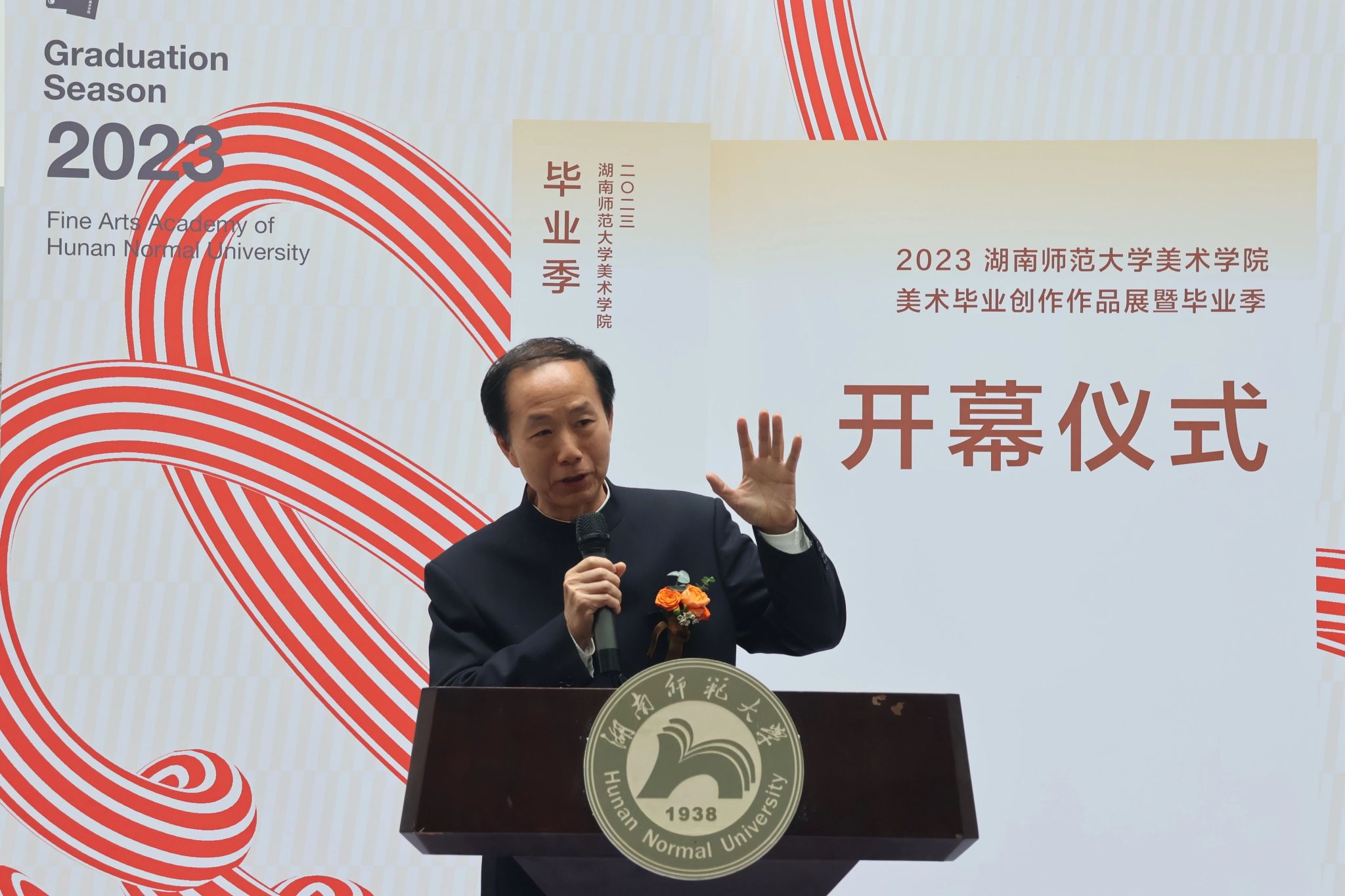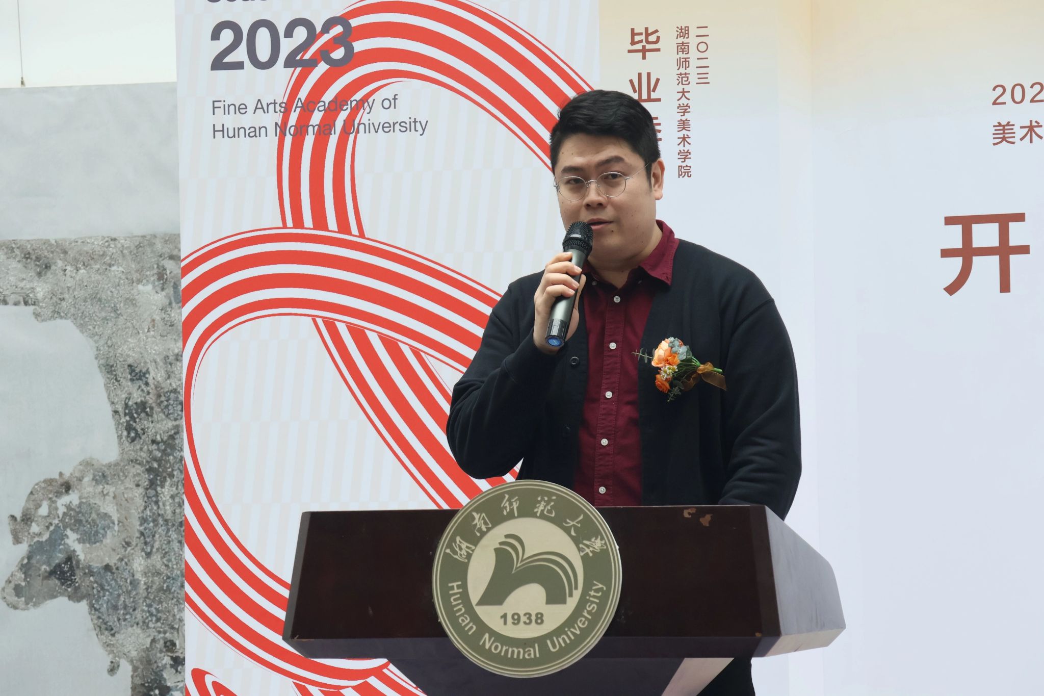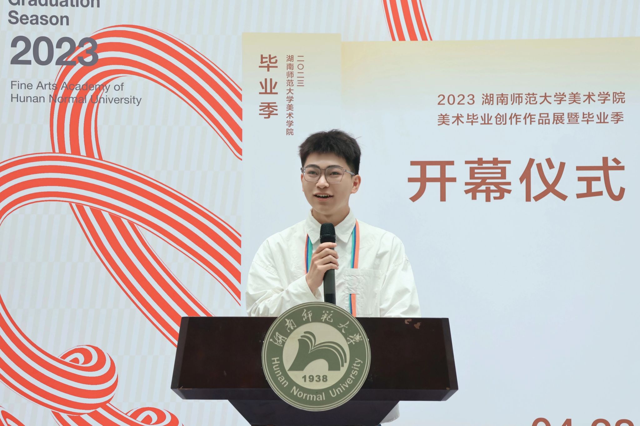学生代表秦念志回想四年的点滴,每一步都离不开恩师和母校的教导,他向学校、老师们,表达最衷心的感谢和最诚挚的敬意!他表示这里的每一幅作品背后都蕴藏着艺术的心灵,相信在未来的艺术人生中一定能绽放新的光芒。今后要永葆昂扬姿态,坚守美院“怀文抱质”的精神,涌入人海,各自精彩!