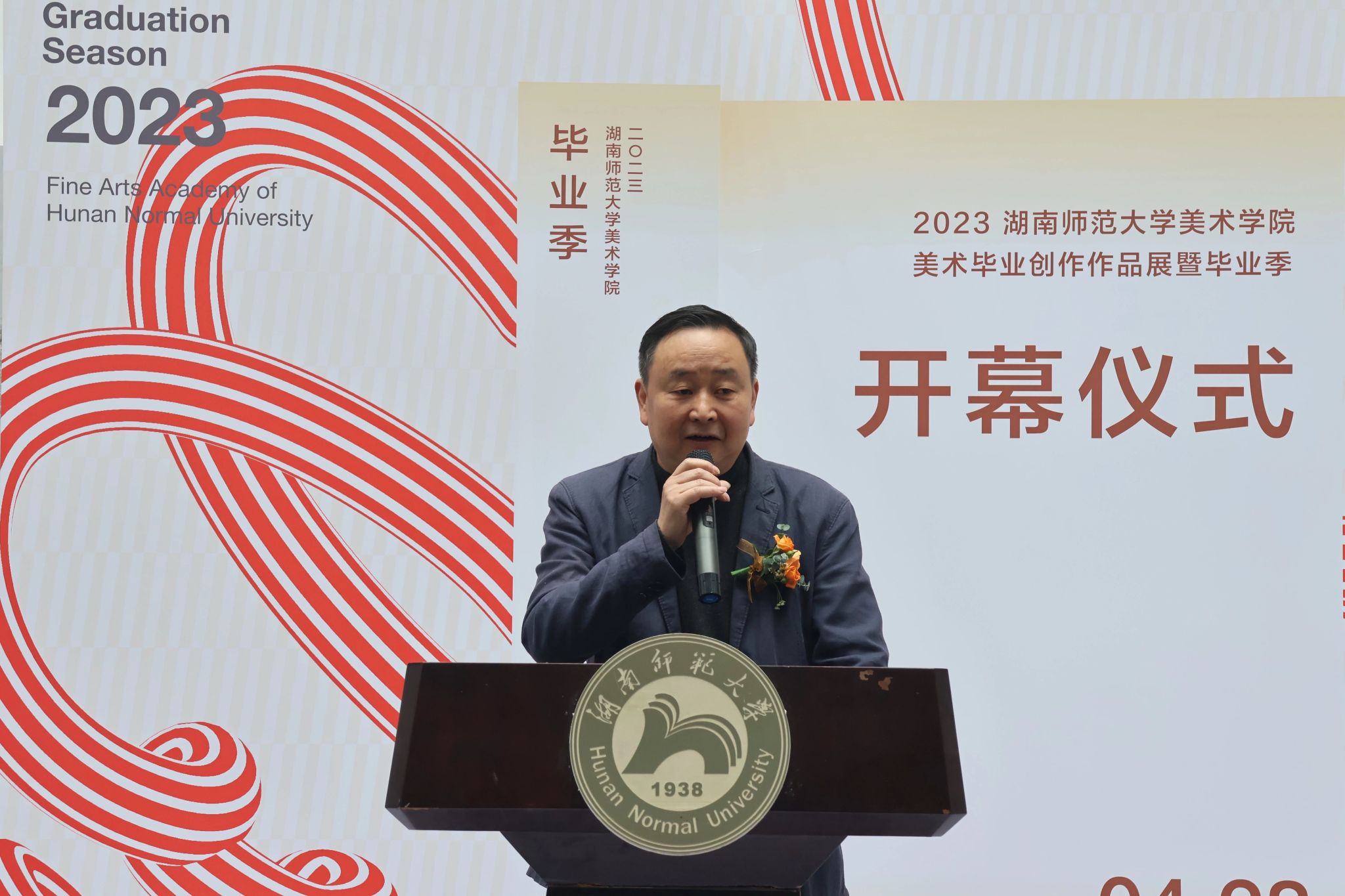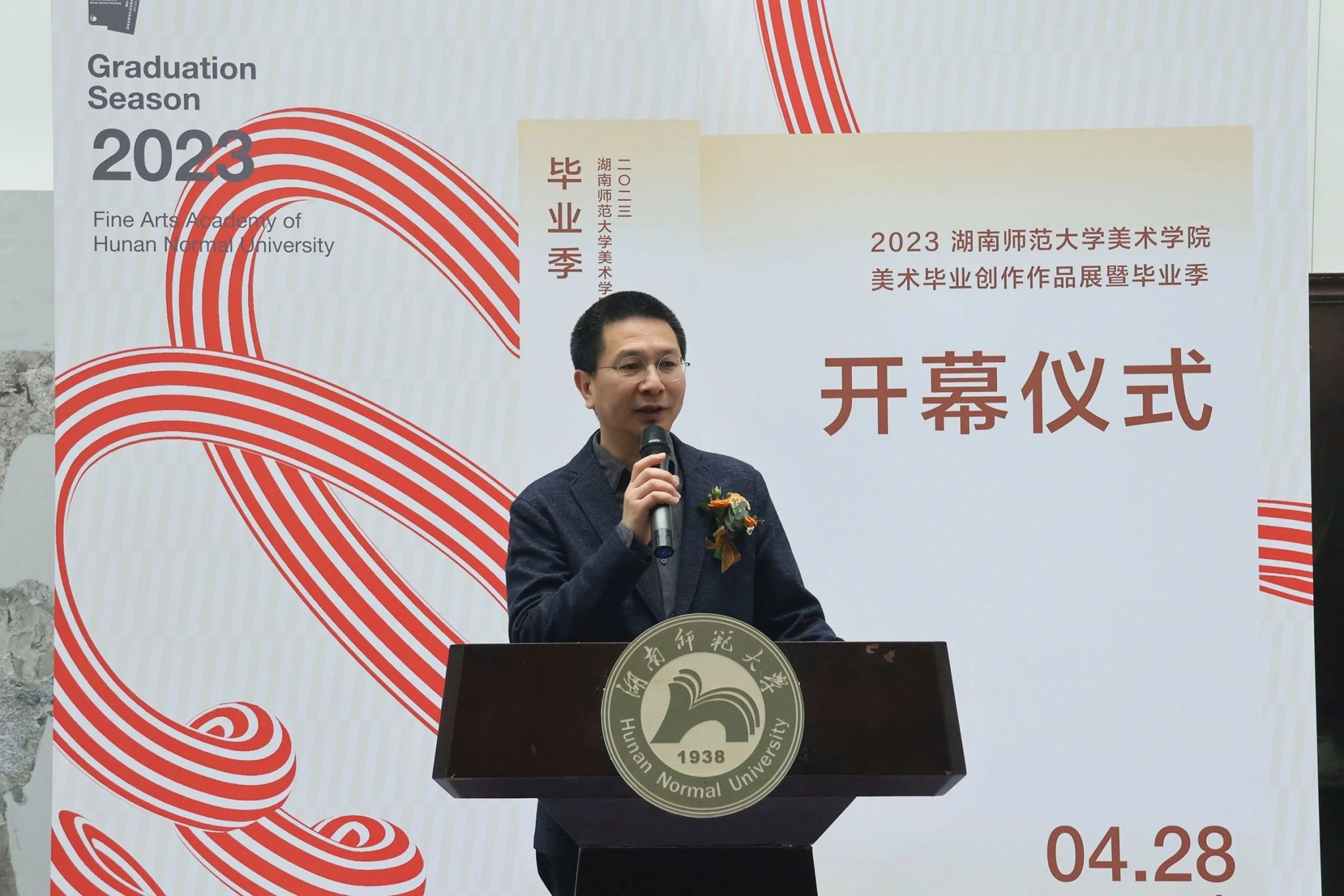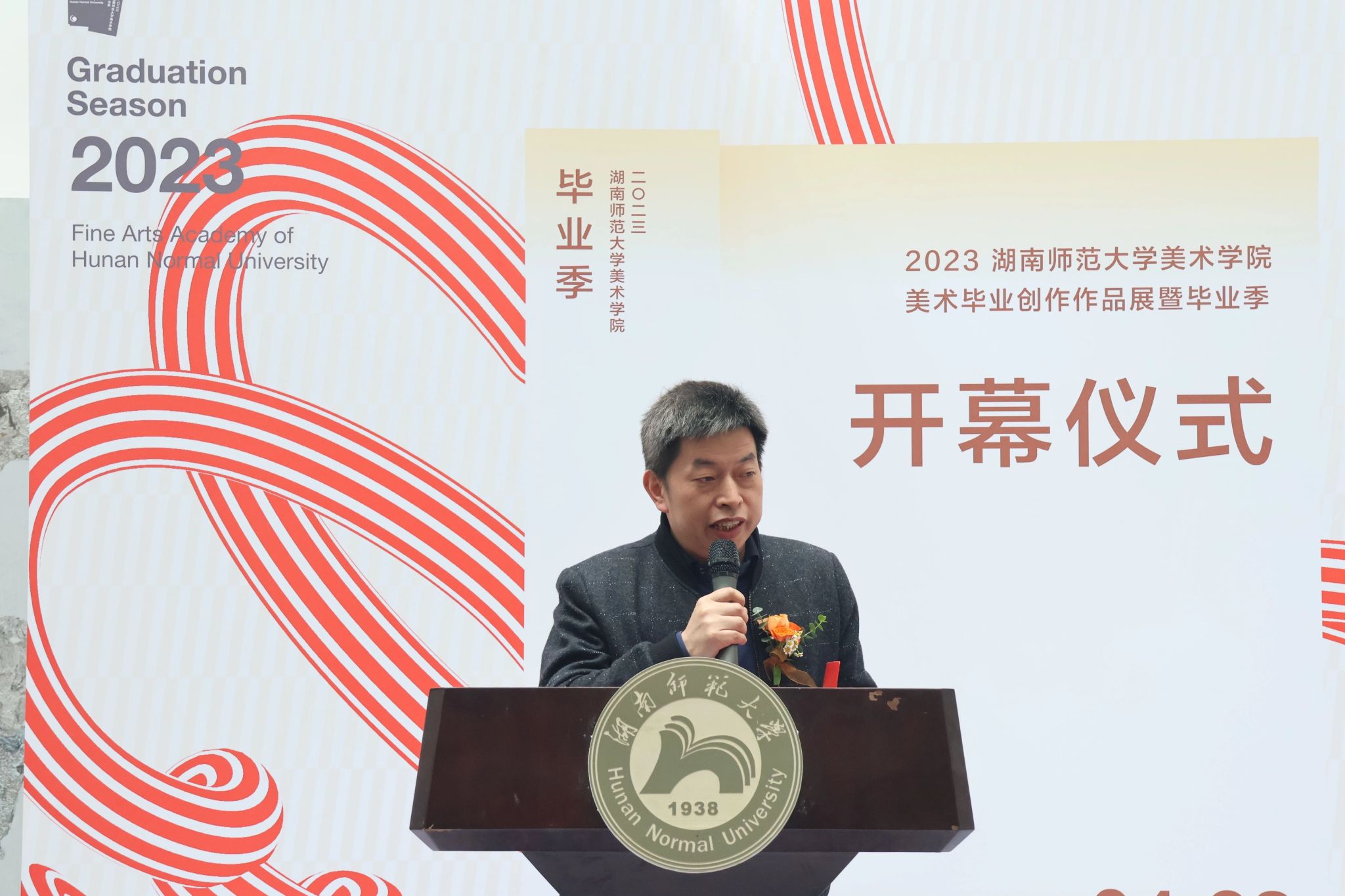 学生代表秦念志回想四年的点滴,每一步都离不开恩师和母校的教导,他向学校、老师们,表达最衷心的感谢和最诚挚的敬意!他表示这里的每一幅作品背后都蕴藏着艺术的心灵,相信在未来的艺术人生中一定能绽放新的光芒。今后要永葆昂扬姿态,坚守美院“怀文抱质”的精神,涌入人海,各自精彩!