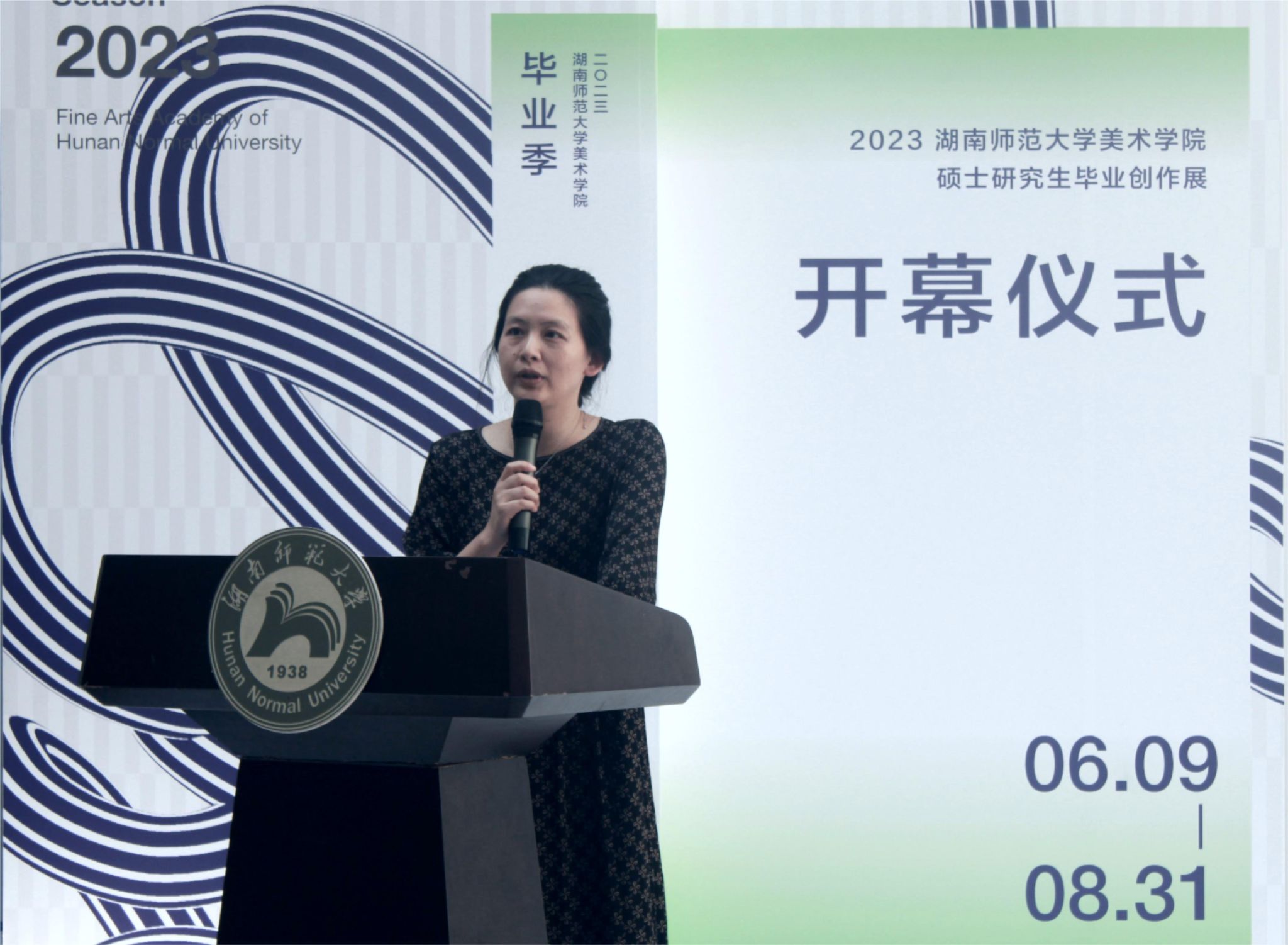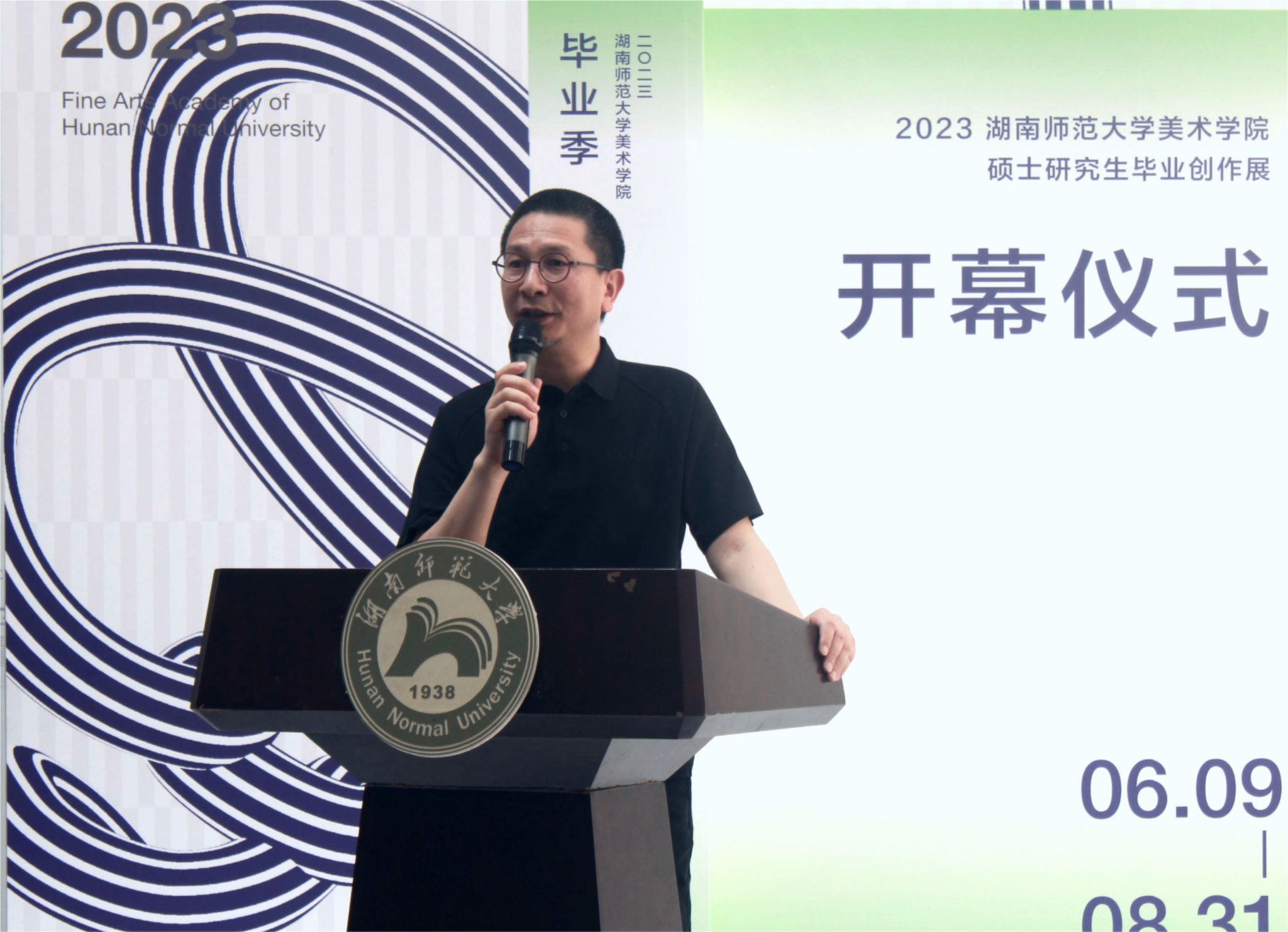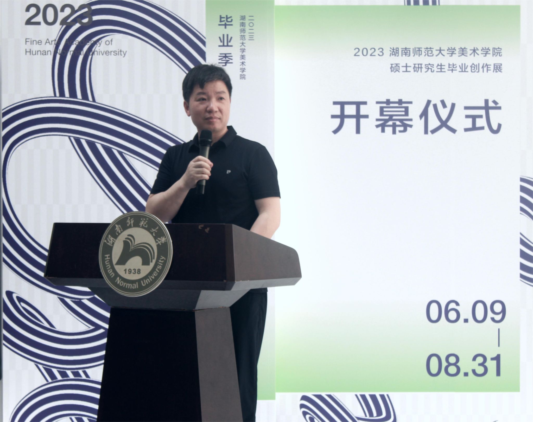 6月9日下午,我院2023届硕士研究生毕业作品展开幕式在美术楼中厅举行。湖南师范大学副校长蒋新苗教授,allwincity万象城官方网站院长李少波教授,院党委书记许杭平老师,副院长江波副教授、邓正付老师,博士生导师朱训德教授、王金石教授、段江华教授、刘永健教授、党朝阳教授,硕士生导师曾进副教授、王奋英教授、谭建明副教授、石明祥副教授、冯晓阳副教授、叶晓兰副教授、何亮老师、吕道建老师,以及学院各办公室主任出席开幕式,开幕式由allwincity万象城官方网站副院长刘湘东主持。