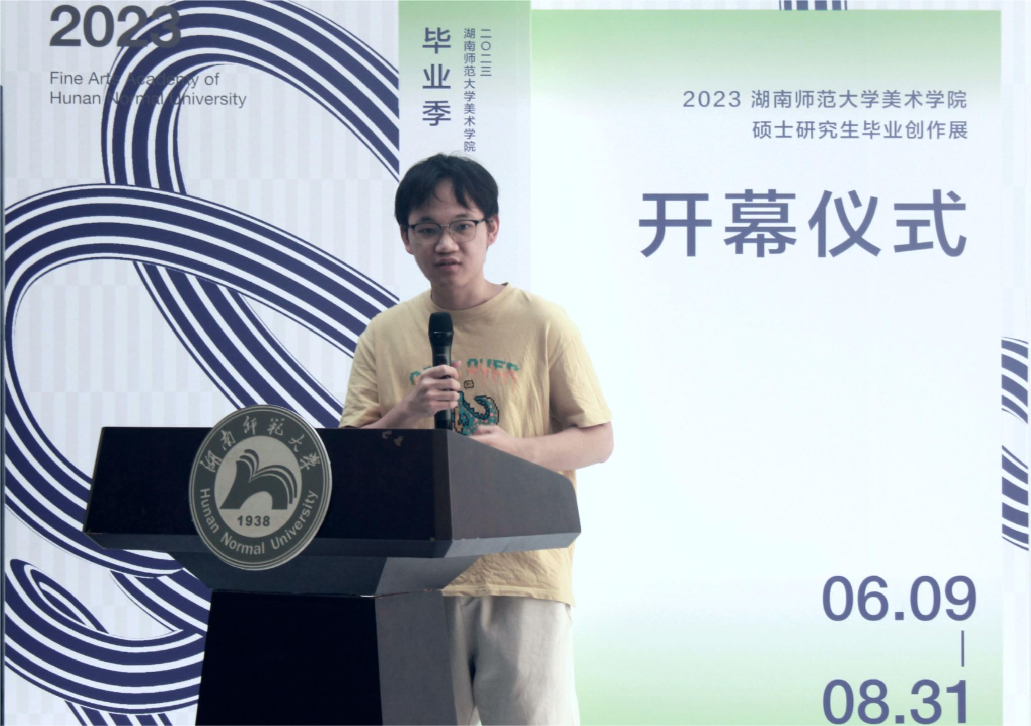 学生代表林嵩山发言,他表示,此次毕业作品展不仅仅是我们研究生三年学习生活的句号,更是同学们艺术生命又一个崭新的起点。每件作品在短暂却又漫长的时光中累积、沉淀、尝试和诞生,承载着理想和希望,凝聚着辛勤耕耘的汗水、不懈的努力与执着,诠释着年轻一代对美的理解和感悟。他祝愿每一位同学能在新的社会大舞台上充分展示自己的才华,实现自己的理想抱负。