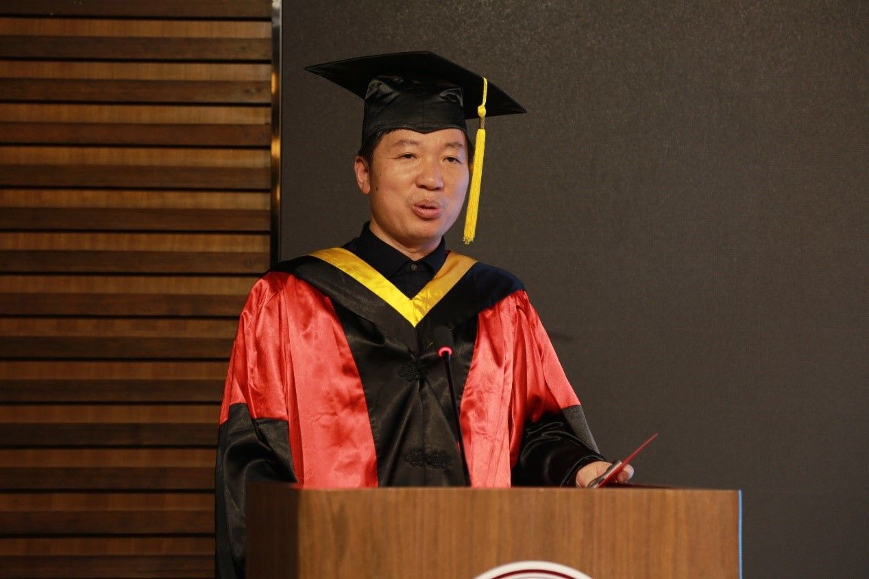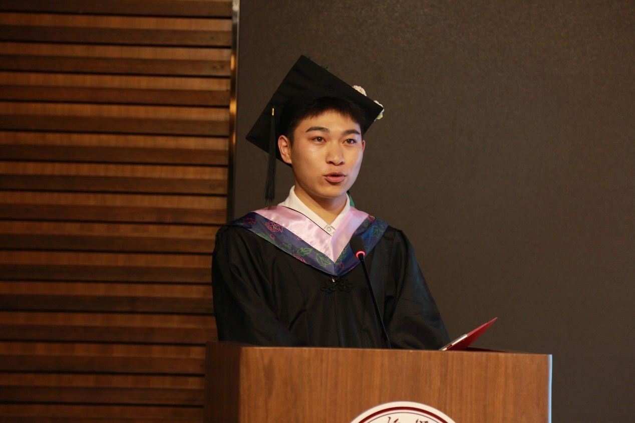 青年教师陈石虎老师代表本科生班导师讲话。他为即将离开的学子们送上最真切的祝福,最殷实的盼望和最真挚的想念。他表示,同学们如一轮红日冉冉升起,有无限的可能性。回望母校这扇门,老师们将骄傲的眼神看着同学们果敢的背影。母校永远是你们坚强的后盾,母校也因为你们而不朽。
