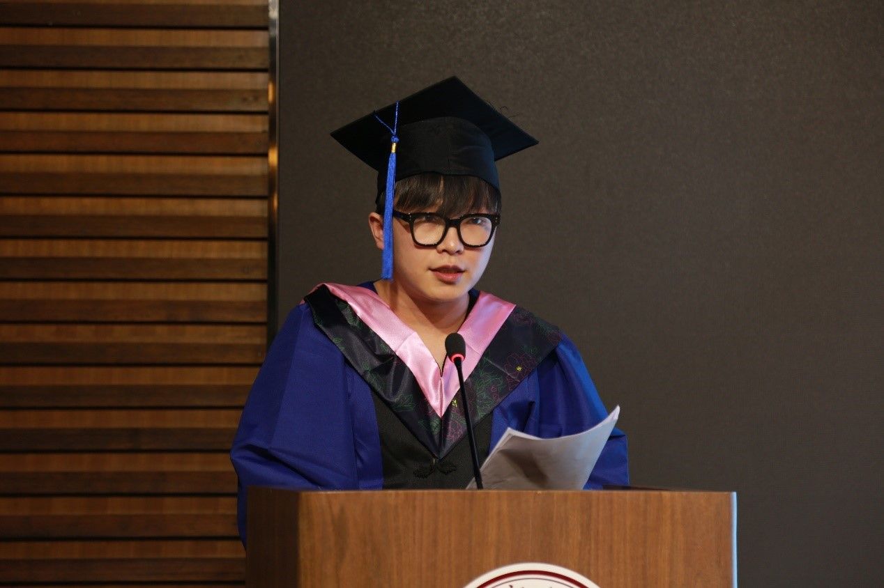 研究生毕业生代表方志豪发言。他向多年以来关心和帮助他成长的学院、老师表达感谢。美院培养同学们走向成熟独立,蜕变为能吃苦、敢担当的新时代青年。同学们将继续贯彻发扬美院学子的优良品质,保持着对世界的探索,对问题的探究和对艺术的热情,继续探索塑造自身,以青春之我,担时代之任。
