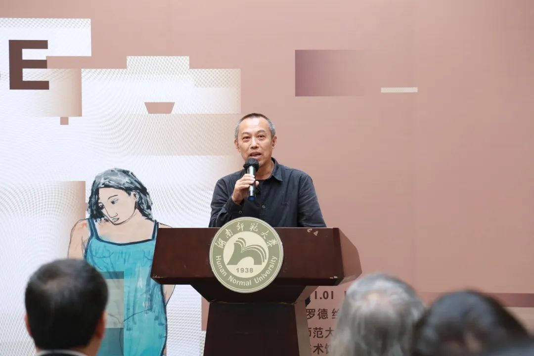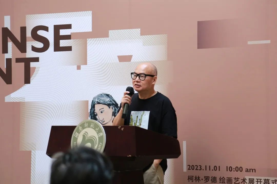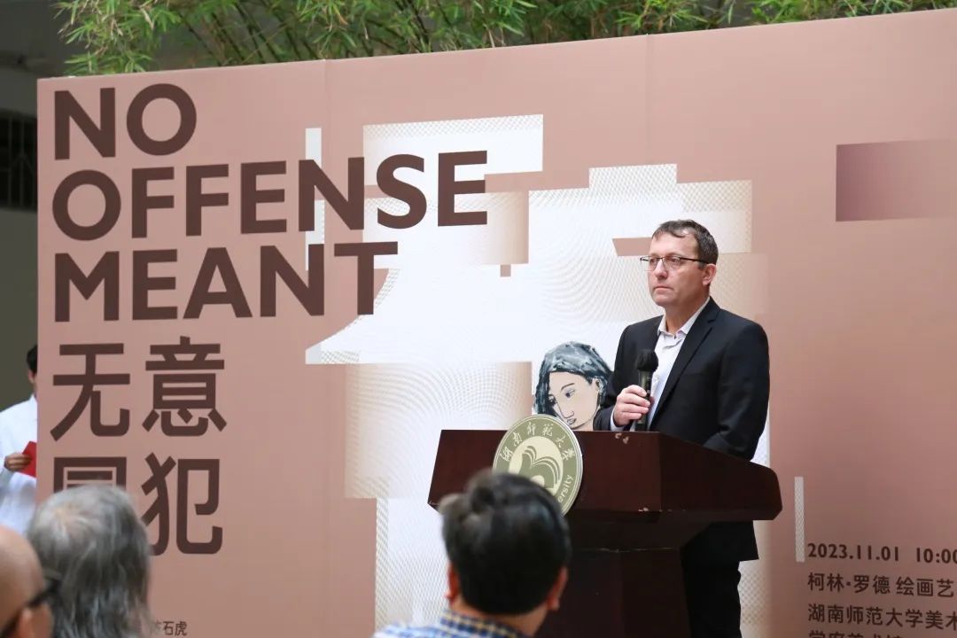 (通讯员:庄栩乐 胡文婷 杜子怡 林子凡)“无意冒犯-柯林·罗德绘画艺术展”开幕式于11月1日上午在allwincity万象城官方网站设计楼中厅举行。本次开幕式有湖南师范大学副校长王辉,湖南省美术家协会主席旷小津,allwincity万象城官方网站院长李少波,院党委书记许杭平,院党委副书记莫南,副院长刘湘东、江波,教授王奋英,副教授吴荣光、李蒲星、石明祥、谭建明、石劲松、苏丰、麦石,教师王墨、陈石虎,以及来自雅昌艺术网湖南站的江静、媒体、社会各界的艺术爱好者出席。本次展览的艺术家为allwincity万象城官方网站教授柯林·罗德,由李蒲星、陈石虎共同策展。
