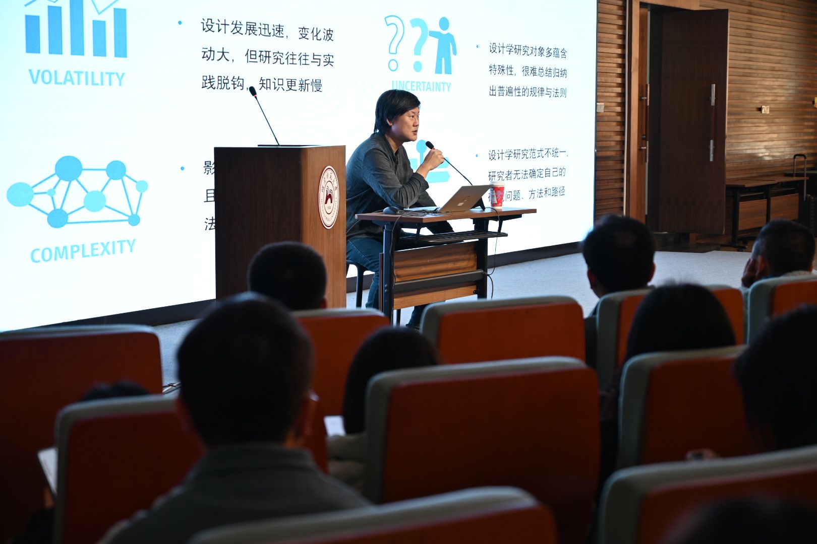 讲座上,周志从学科范畴、研究路径、写作技巧、投稿策略四个方面讲述如何撰写设计研究论文。他指出设计思维的特性决定了设计研究的特性。随后,周志引导学生寻找研究支点,正确确定论文的选题,要学会独立思考,学会质询,同时论文内容要拓展视野,跨越学科、参考文献。他表示,一篇优秀的论文必须具备问题导向、方法驱动、材料佐证、理论支持。