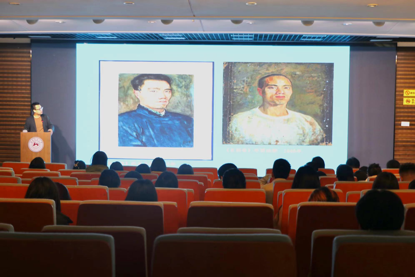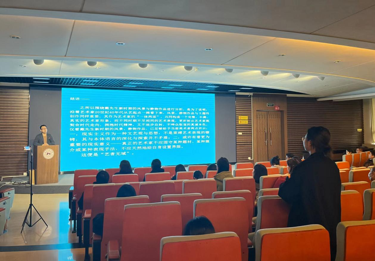 杨灿伟博士首先对戴泽先生进行了全面介绍,讲述戴泽先生跟随徐悲鸿从师七年的求学经历。接着,他着重分析了戴泽先生的艺术展作品,强调其作画风格大多植根于生活,散发着生命的力量。戴泽先生以朴素记述生活,以具象写实来表现对象,杨灿伟博士希望同学们在学习戴泽先生创作的风景画中能够不断的反思自己,形成勤劳朴实的作画态度。最后,杨灿伟博士展示并讲解了戴泽先生的水墨画作品以及他一生挚友韦启美的文章,让同学们看到了戴泽先生主张作画要理解体积,要有宁方勿圆的态度,以及以自然为美的艺术观。