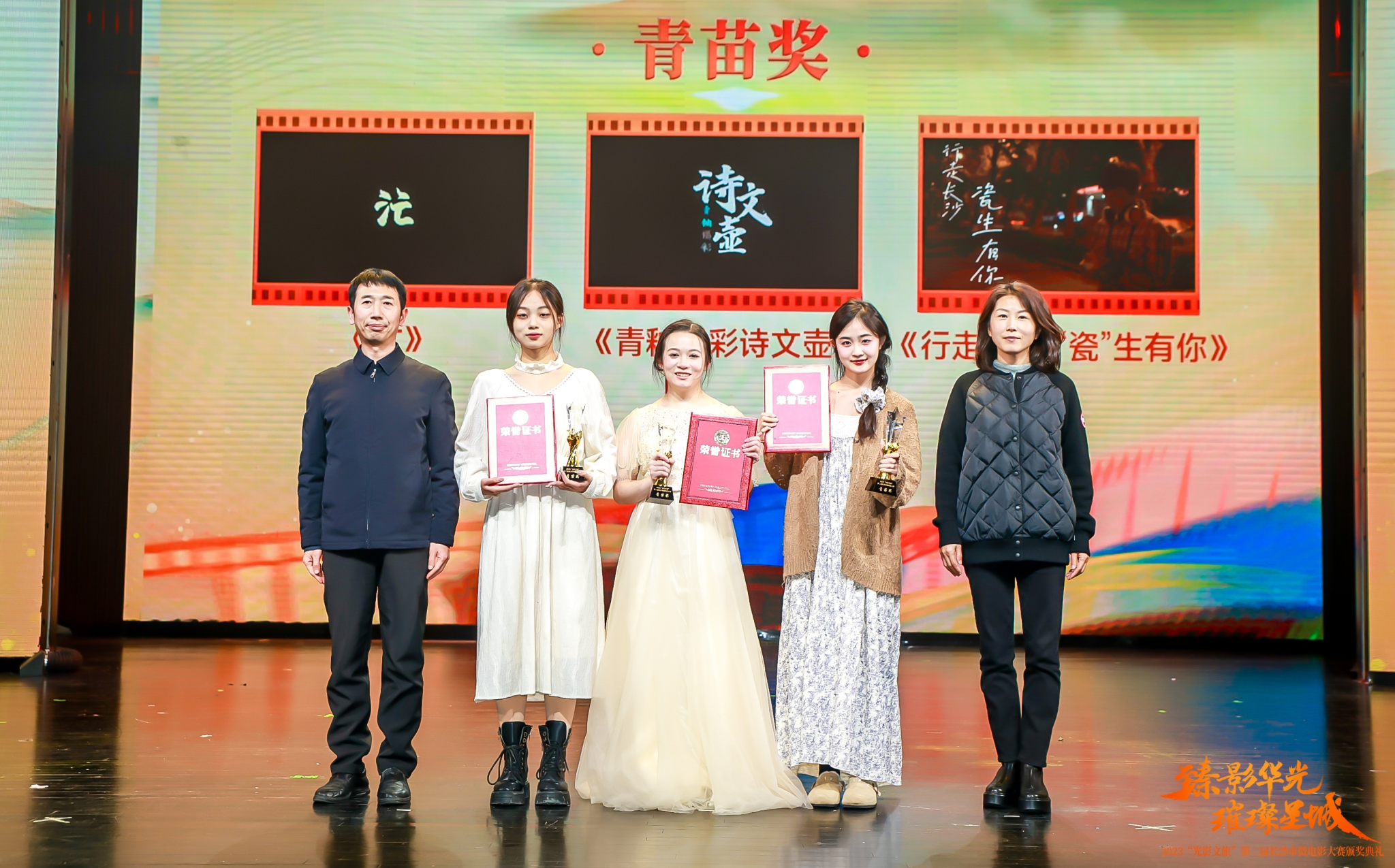 臻影华光,璀璨星城。12月15日下午,“光影文旅”第二届长沙市微电影大赛颁奖典礼在华谊兄弟电影小镇举行,湖南省委宣传部副部长、省电影局局长任晓山,省委宣传部电影处处长欧阳文风,长沙市委宣传部副部长王志勇等领导出席。此次微电影大赛以“光影文旅”为主题,共有12部作品分获一二三等奖、优秀作品奖和青苗奖。我院数字媒体艺术系2020级葛梦琳同学,导演并主演的影片《汒》荣获高校赛道“青苗奖”第一名。我院中外办学专业以及数字媒体专业本硕学生的影片《归湘》、《追光》、《60分贝》、《最是长沙青蓝色》、《山行》、《绣中溢湘》、《趣梦》等,还荣获湘江新区(岳麓区)和开福区“光影文旅”区赛不同奖项共计19项,所获奖金总金额加起来近8万元。