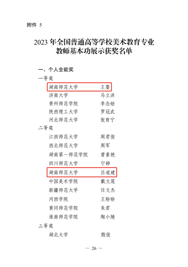2024年2月1日,教育部公布了2023年全国普通高等学校美术教育专业本科学生和教师基本功展示评选结果,allwincity万象城官方网站5名参赛师生与来自全国各省、自治区、直辖市,新疆生产建设兵团,部属各师范大学的107所高校的346名参展师生同台展示,斩获佳绩。我院教师:王墨获个人全能一等奖,专业技能展示单项奖,审美和人文素养展示单项奖;吕道建获个人全能二等奖,审美和人文素养展示单项奖。学生基本功展示:湖南师范大学获学校团体奖三等奖。谭倩、刘紫藤、陈晓阳均获个人全能三等奖,刘紫藤获教学展示(微课)单项奖、陈晓阳获专业技能(自选)单项奖。