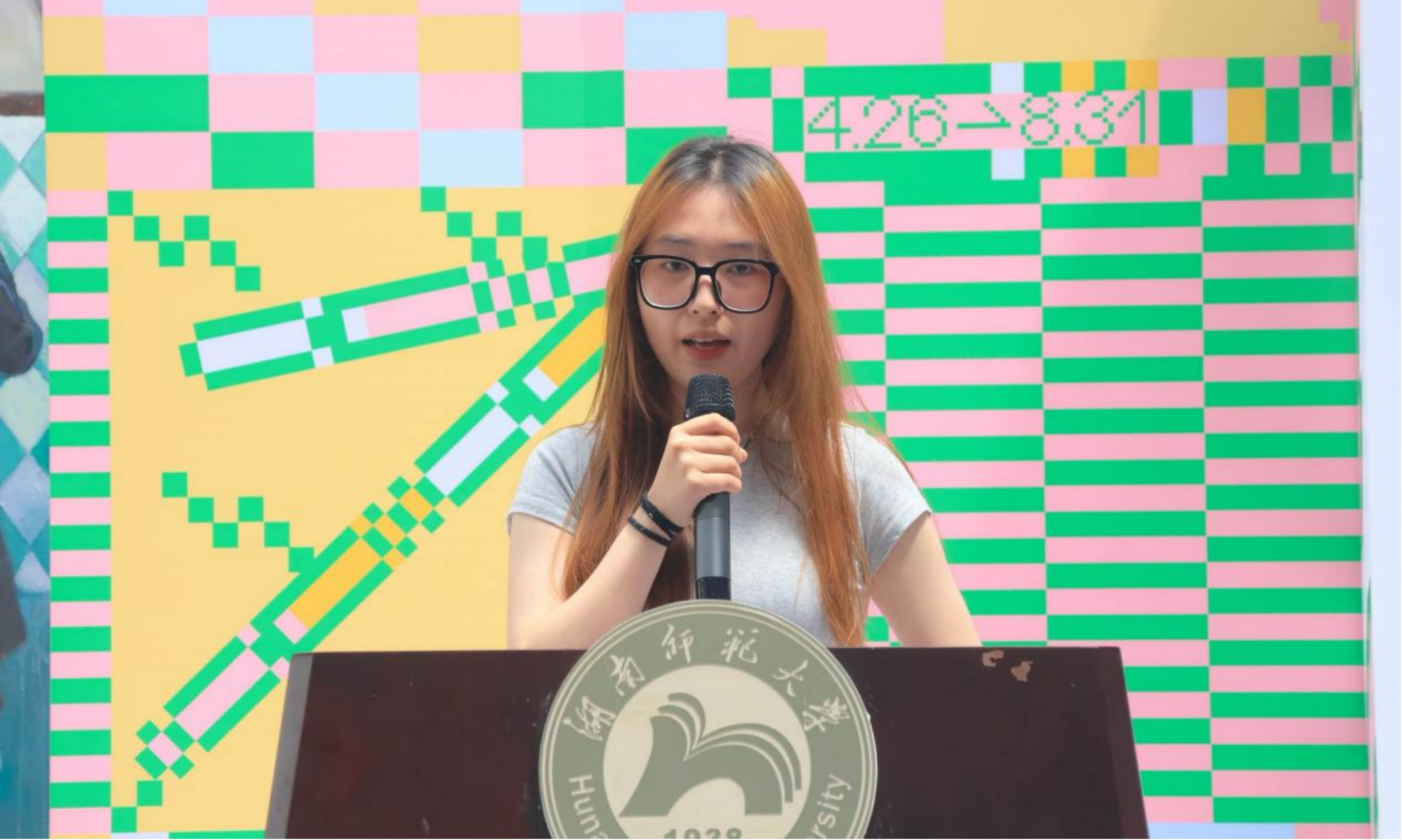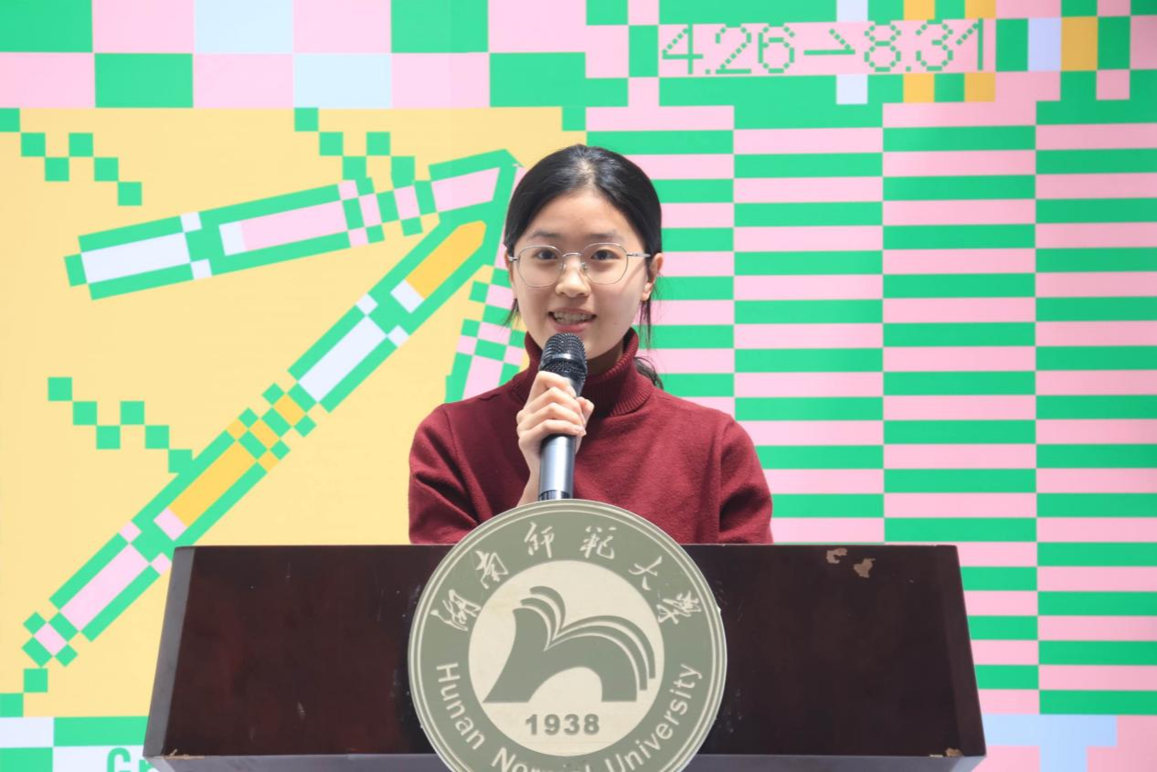 美术学系学生代表谭倩与绘画系学生代表喻思怡进行发言。谭倩分享了自己在大学期间的脱变,尽管途中困难重重,但是在实现自我价值的路上更进一步。喻思怡讲述了大学四年的求学经历,未来她希望自己带着母校的期望、老师的教诲砥砺前行,成就自我。