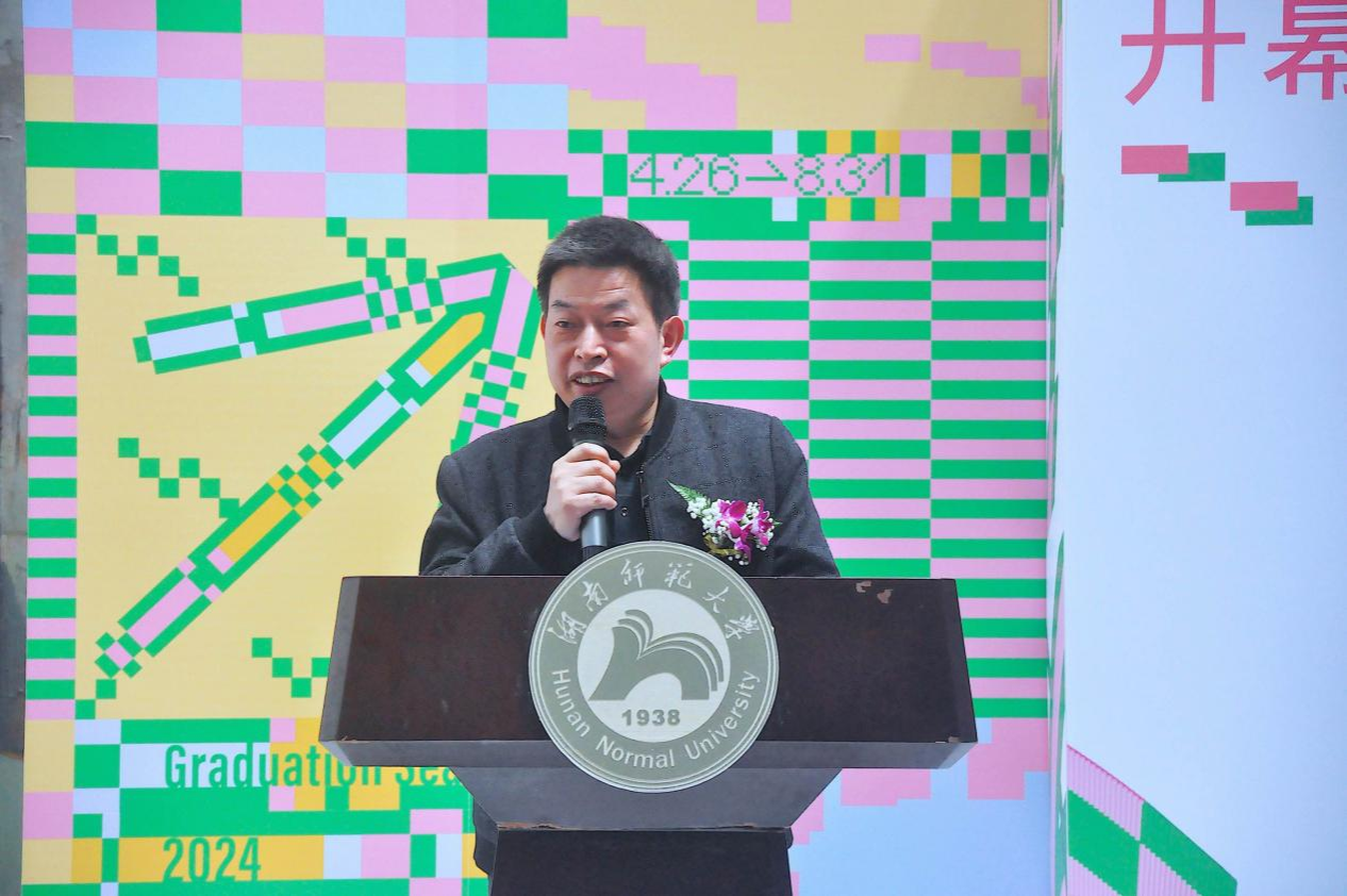 院长李少波代表学院感谢莅临现场的嘉宾对学生的关爱及学院的支持,并感谢每一位对毕业创作作品展辛勤付出的老师,正是他们的无私奉献打牢了学院进步的基石。他希望每一位毕业生在未来的发展历程中能够产出成果,实现目标,大家的卓越发展也是学院自信的底色。