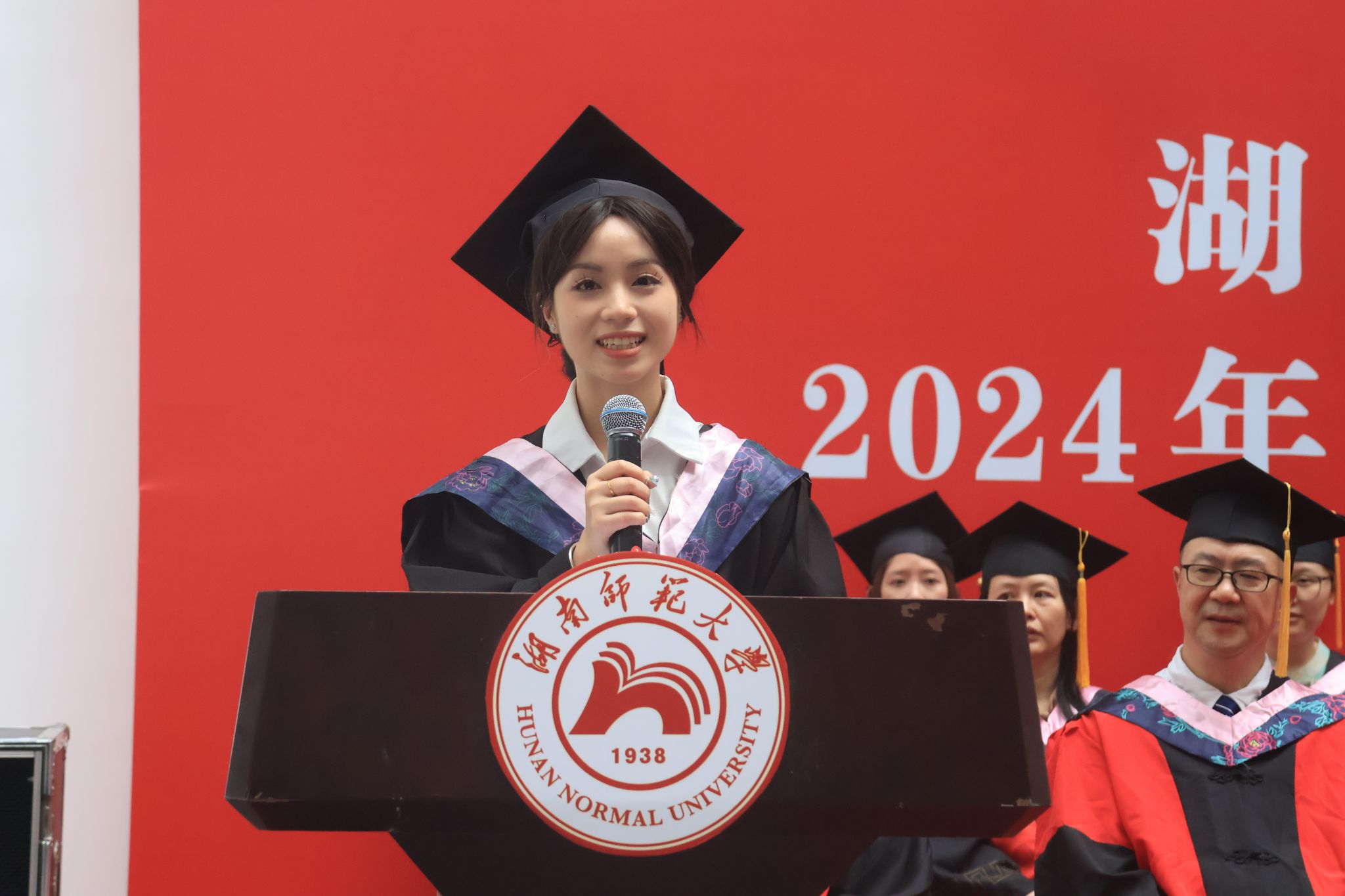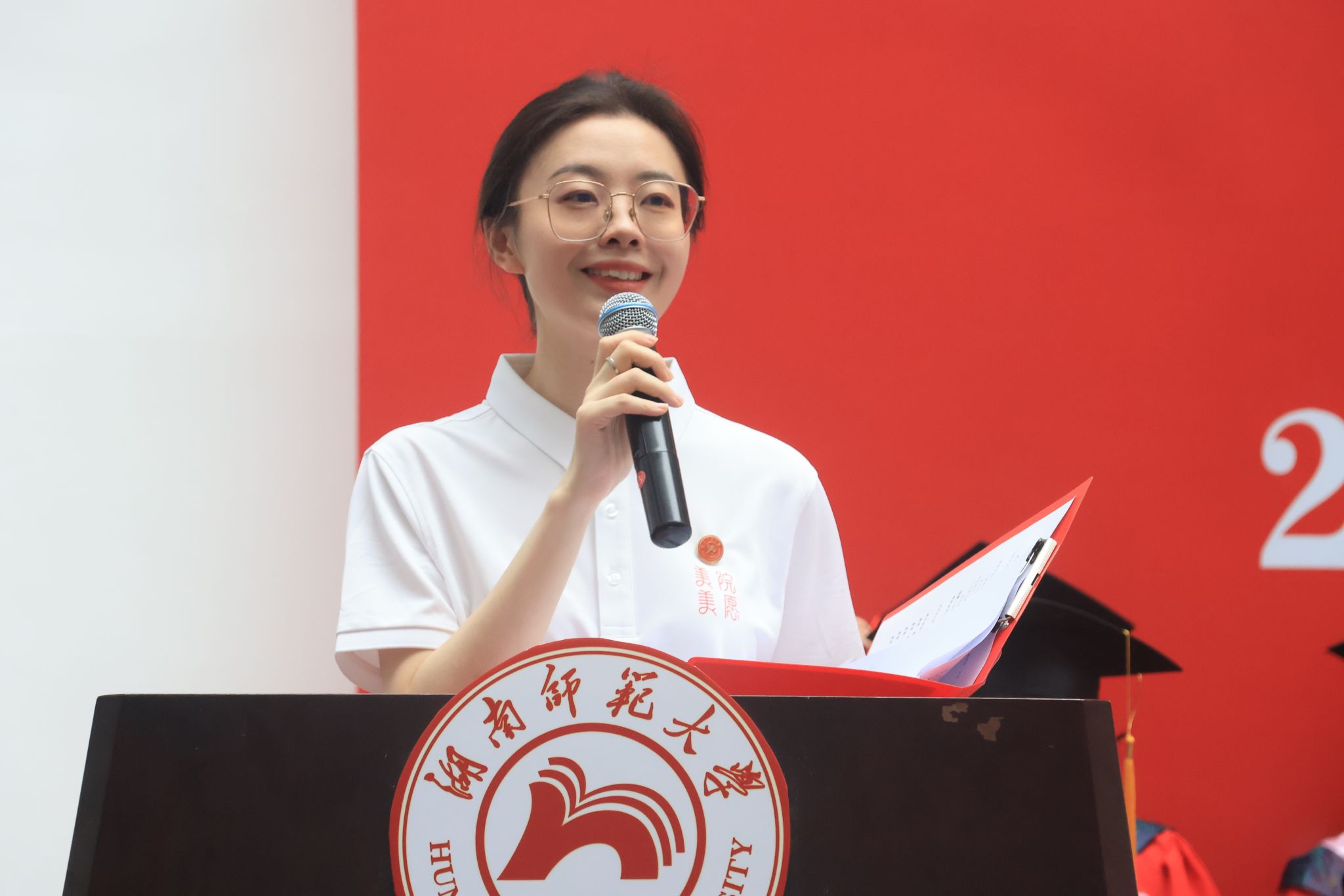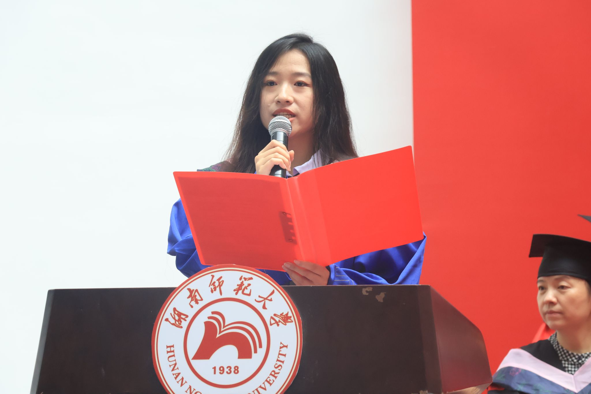 研究生毕业生代表赵梦玥发言。她回顾了研究生三年时光里的成长历程,在老师们的引领下,在矛盾中发现问题、总结思想、汲取养分。同学们在追求价值的道路上不断的收获,做一个有思想、有情感的人,踏上新的旅程。