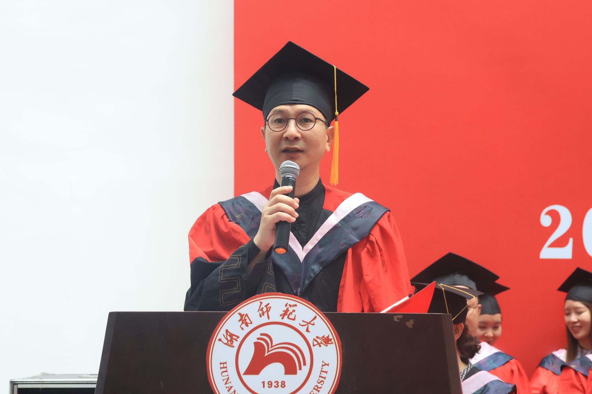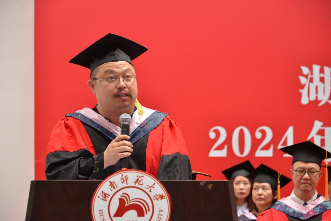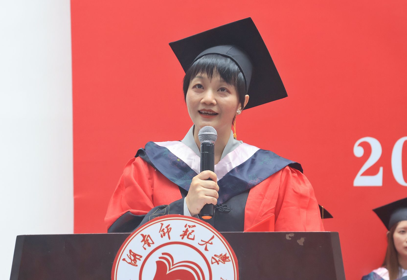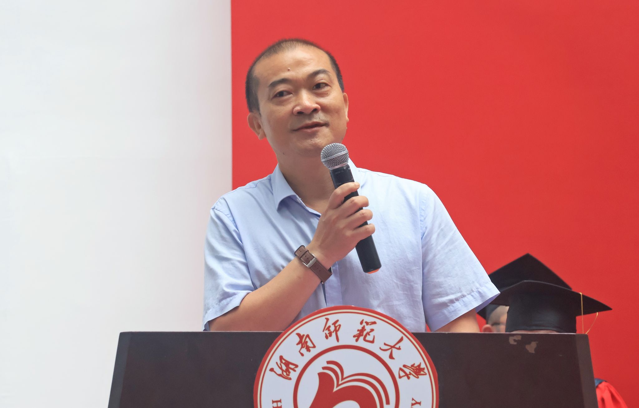 肖弋教授代表研究生导师讲话。她为即将离开的学子们送上最真切的祝福,感谢学院培养了这么多双发现美的眼睛。她希望同学们笃定人文精神内核,以内驱力生成创造力,持续努力向着目标前进。学会停下脚步,杜绝内耗,以审美态度生活,体会生命之美。鼓励同学们养成独立人格的奋进精神,保持学习思考,掌握新技术,接纳新变化,日后必将百川东到海,汇集为国之大器力量,在人工智能时代,焕发人文精神的璀璨光彩。
