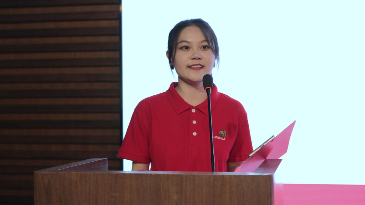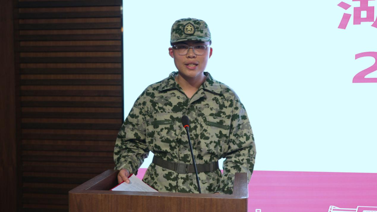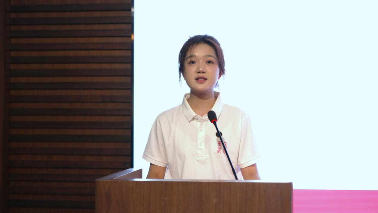 老生代表、2021级美术学专业殷孟姣同学鼓励新生积极参加各类竞赛来展示能力和锻炼自我,同时也提倡在实践中应用所学知识,通过社会实践来提升实际操作能力和创新精神。并寄语新生要以奋斗的姿态迎接挑战,共同创造美好的未来。