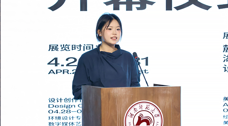 数字媒体艺术系毕业生代表赵军欢分享了创作过程中的收获与成长感悟。他提到,大学四年的学习让同学们学会用设计语言与社会对话,未来将继续在技术与人文的共振中,描绘智能时代的可持续发展蓝图。环境设计系毕业生代表欧阳明以“传承与新生”“突破与重构”“温度与力量”为主题,回顾了大学四年的成长历程。她代表全体毕业生向母校、老师和同学表达了诚挚感谢,并表示将带着美院的信念,以设计为笔,书写时代答卷。