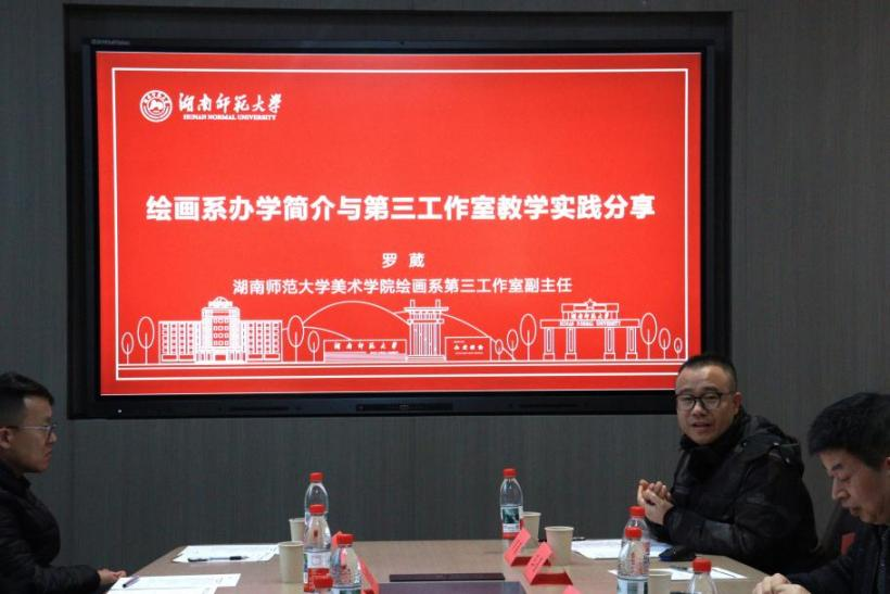 交流互动环节气氛热烈融洽,思想碰撞不断。美术学系副主任王墨围绕“用美术语言描绘中国故事的美术师范专业育人实践”主题,详细阐述了美院在课程体系构建、实践教学改革、师生创作引领等方面的具体做法;绘画系第三工作室副主任罗葳分享了绘画专业在教学方法创新、学生实践能力培养中的宝贵经验。两地教师还就民族文化融入美术教学、红色主题艺术创作、师范人才培养模式等议题展开深入探讨,双方各抒己见、互学互鉴,在交流中凝聚共识、在探讨中共同提升。