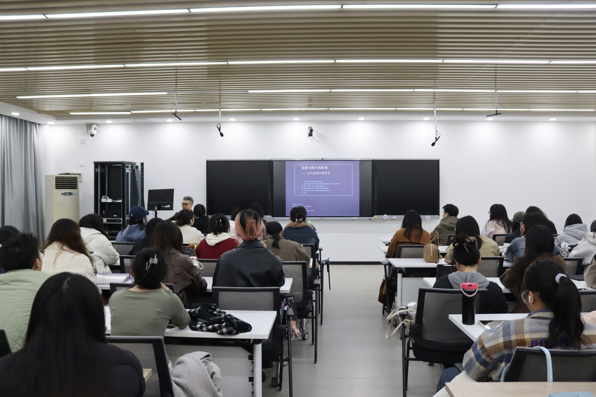(通讯员:刘紫藤)2024年11月25日开始,中国美术家协会美术理论委员会主任、湖南师范大学潇湘学者尚辉教授为我院2024级艺术学及美术专业研究生80余人带来了《美术理论前沿研究》的精彩课程,教学主要围绕“绘画与照片的距离——当代绘画问题研究”、“从笔墨个性走向图式个性——20世纪中国山水画的演变历程及价值观念”等专题分阶段进行了美术理论前沿理论深度的授课。本次课程在设计楼207教室进行,我院莫高翔教授、王奋英教授等教师现场聆听了课程。