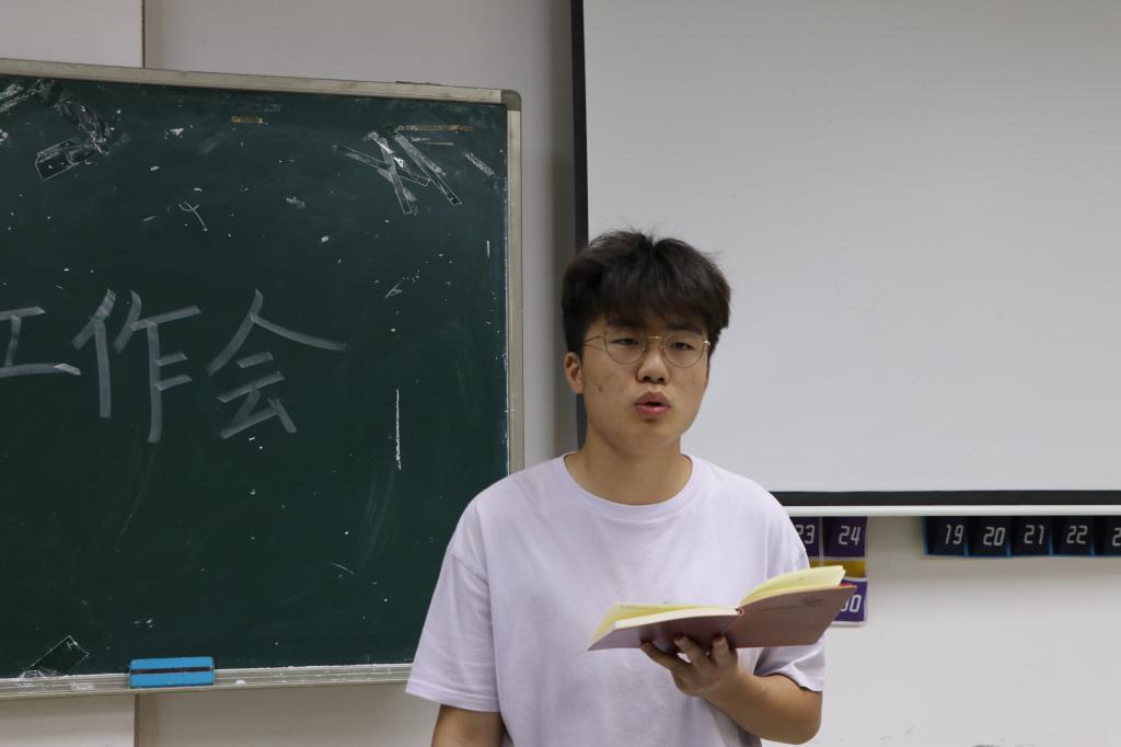 刘杰讲话,他希望同学们牢记学生干部使命,不忘竞选初心,增强自身专业能力,成为学生榜样。在常规工作的开展中,他提到每一个系统主任要有自己的工作想法和创新,为学院的学风建设服务,加大活动宣传力度,让更多的同学了解并参加到活动中来。同时要建立学生和老师以及学校的桥梁和纽带,更好的传递学生心声与想法。他最后强调三会一中心整体要团结一心,互帮互助,系统要各司其职,各尽其能,共同推进学院的建设。