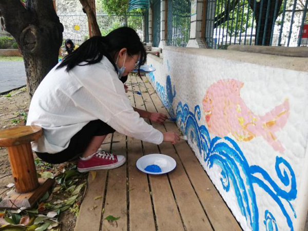 提着颜料,拿着刷子,志愿者们十分有耐心地在十几个轮胎上画了起来,有黄色的轮胎,有蓝色的轮胎,也有的画成了七星瓢虫,还有画成了小黄人。除了画轮胎,志愿者们还把幼儿园的墙壁上的图案也都给翻新了一遍,现在墙上都感觉焕然一新了!