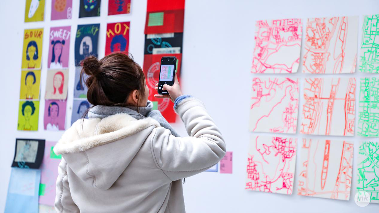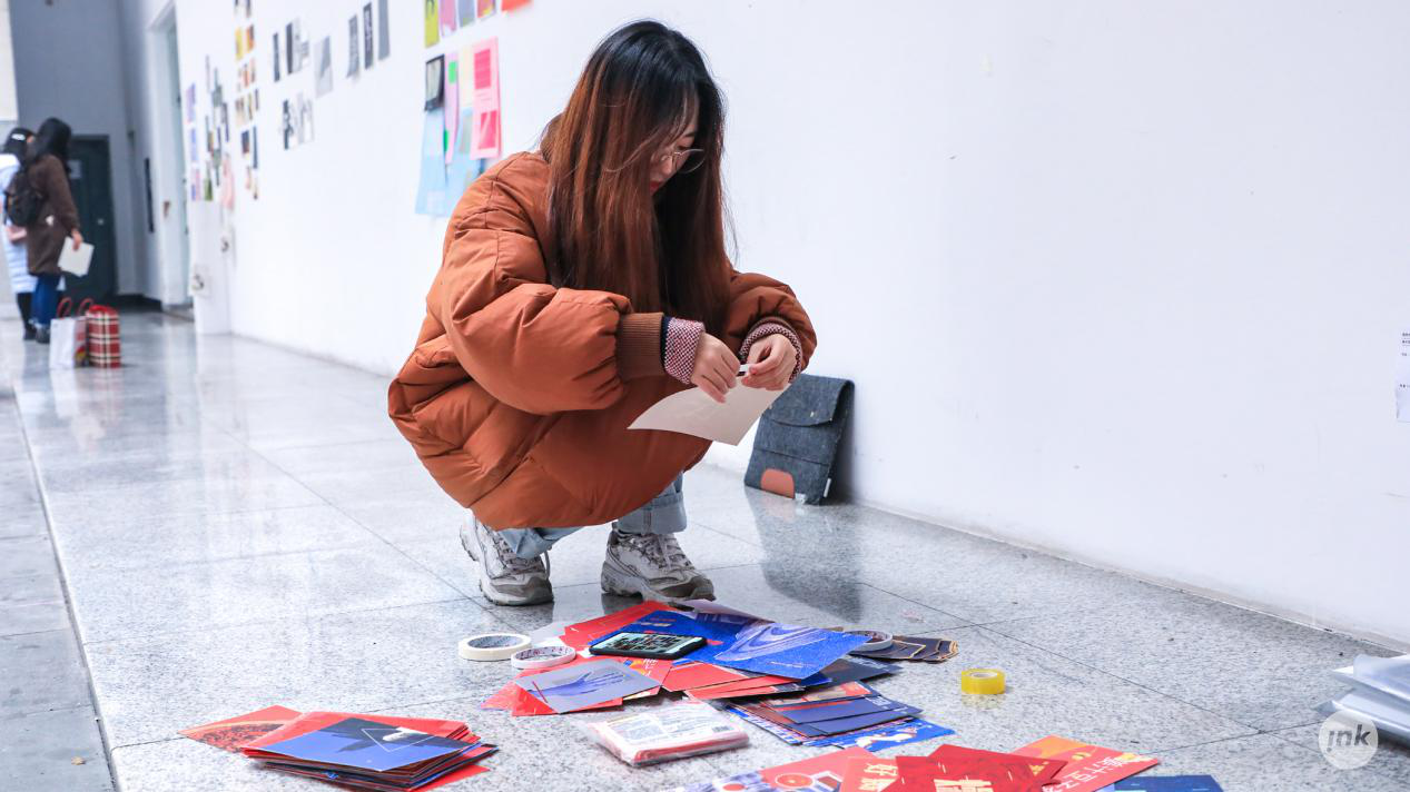 刘京莎老师说到,作为一名专业教师,我不希望在一成不变的教学思路和模式下不断重复同一门课程。没有挑战性的工作方式无疑会让你对教学失去兴致,可改变与尝试也意味着要承担风险。这次课程,从方案讨论、印刷制作到布展过程,始终充斥着各种“碰撞”和“故障 ”,同学与老师都在不断的否定,在偏差中修正方向,这些经历无疑是宝贵的。虽然从最终效果呈现上来看还存在不少遗憾,但每一张作品都是真诚的、用心的。刘京莎老师补充道,现场还会有抽奖环节,期待大家前来交流。