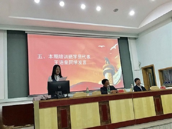 第63期培训班优秀成员代表熊灿莹,本期入党积极分子学员代表王语泉作为新老代表先后发言。